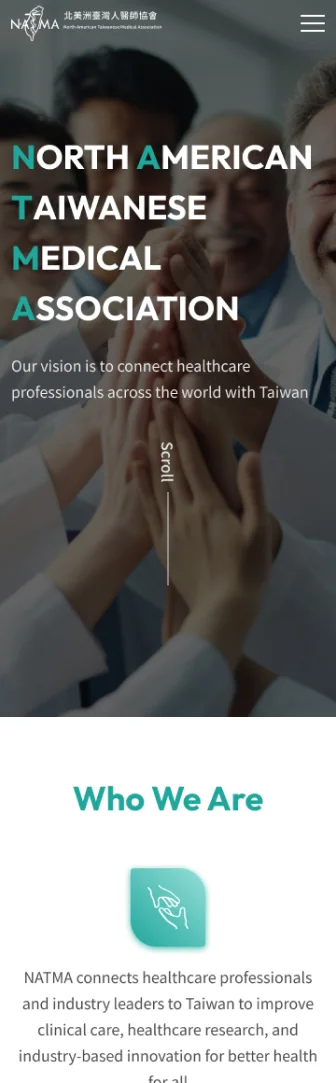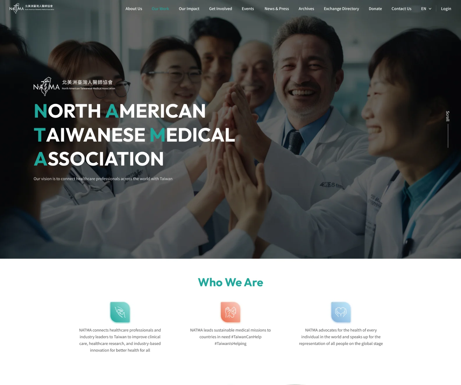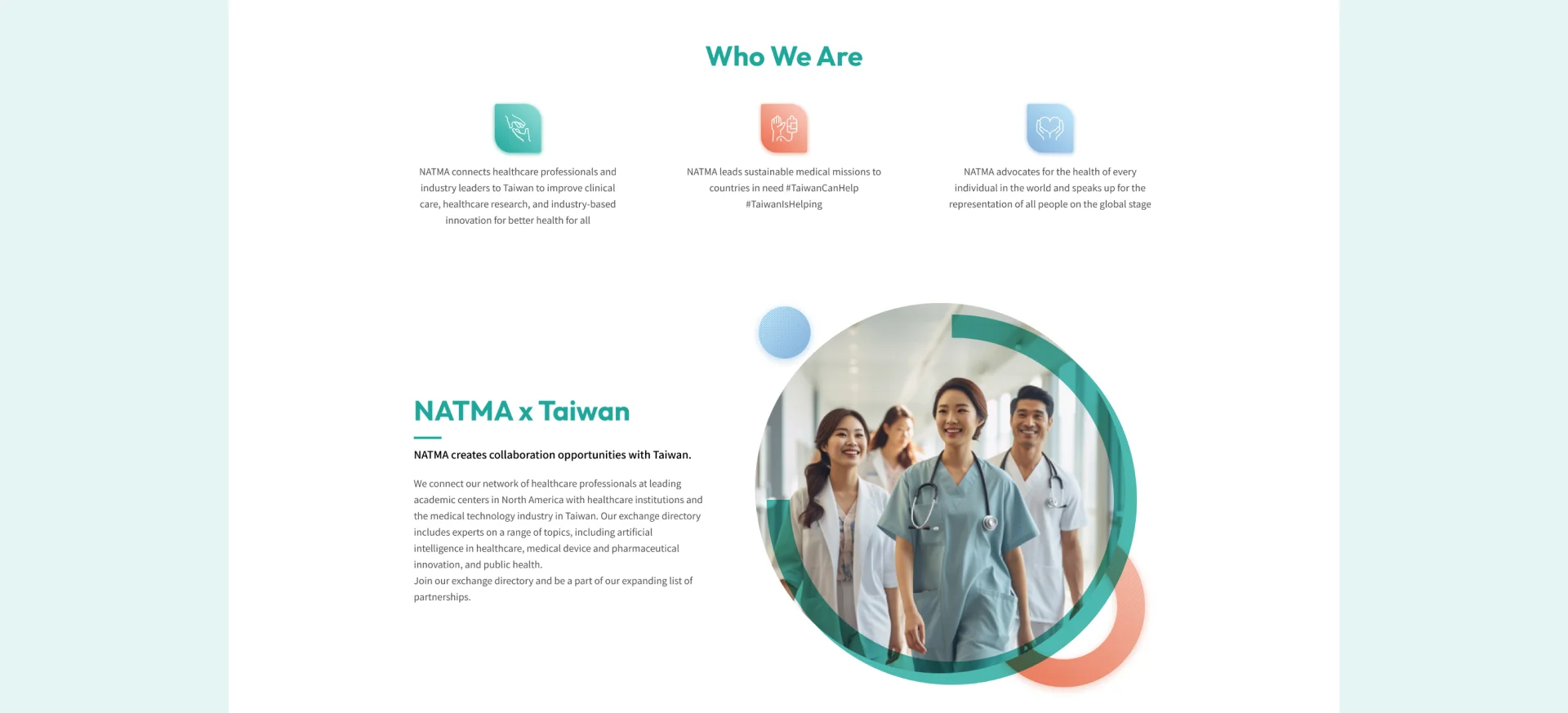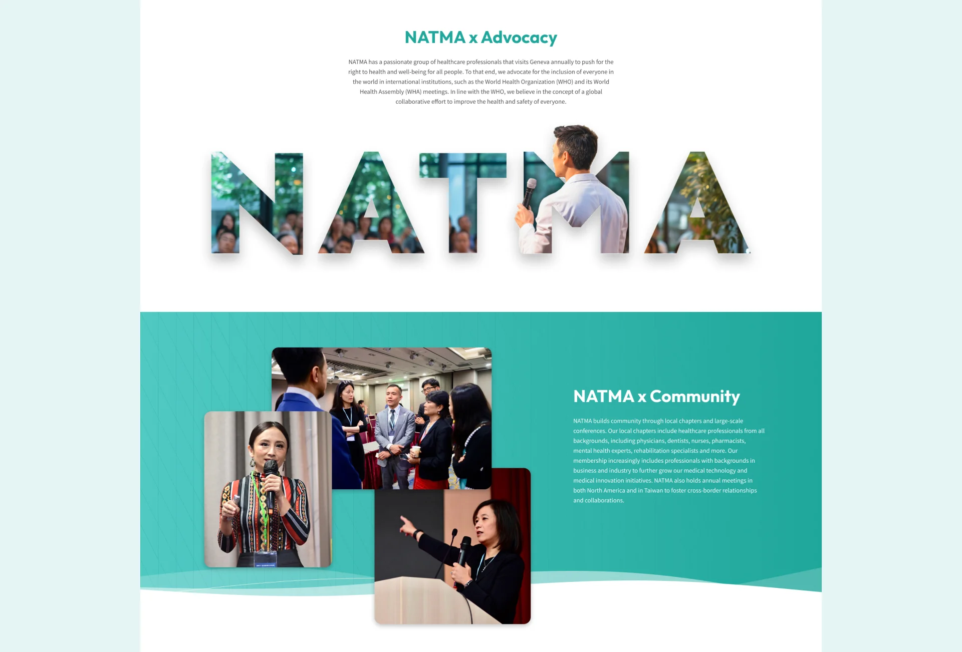NATMA 官網的內容架構以核心理念與行動成果為主軸,從「Who We Are」帶出組織宗旨,再延伸至「NATMA x Taiwan」、「NATMA x Global Health」、「NATMA x Advocacy」、「NATMA x Community」等專區,逐層呈現其在國內外的角色與貢獻。網站透過主題切版與影像輔助,清晰展示醫療任務、跨國交流與倡議工作,同時在頁面下方配置「News & Press」、「Our Supporters」與「Contact Us」等模組,讓使用者能即時掌握最新動態並進一步互動。