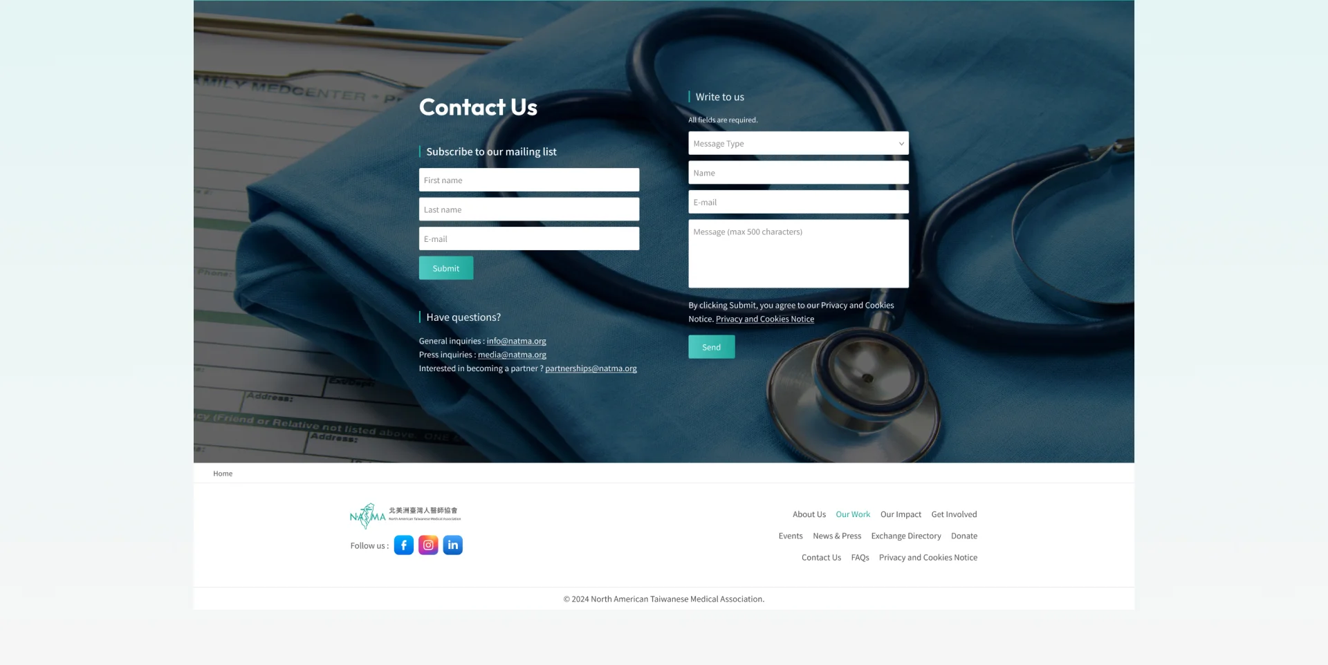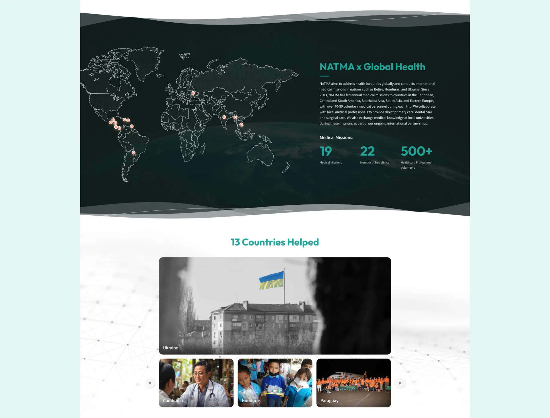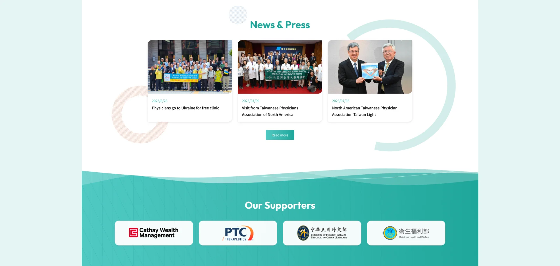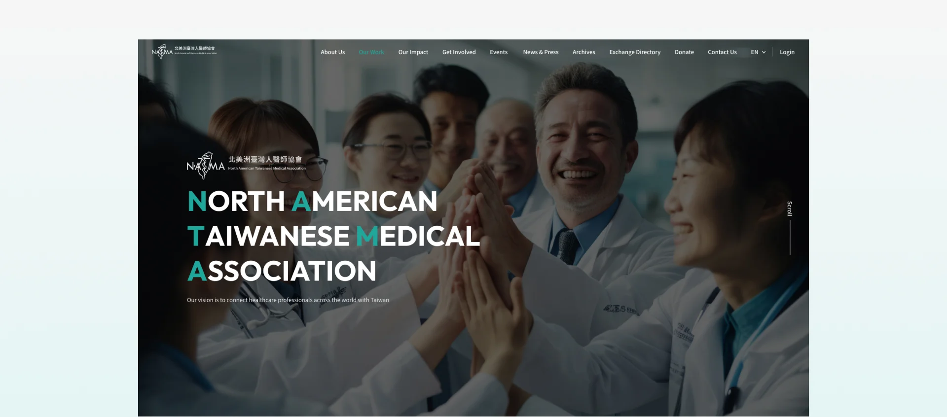 NATMA 官網的內容架構以核心理念與行動成果為主軸,從「Who We Are」帶出組織宗旨,再延伸至「NATMA x Taiwan」、「NATMA x Global Health」、「NATMA x Advocacy」、「NATMA x Community」等專區,逐層呈現其在國內外的角色與貢獻。網站透過主題切版與影像輔助,清晰展示醫療任務、跨國交流與倡議工作,同時在頁面下方配置「News & Press」、「Our Supporters」與「Contact Us」等模組,讓使用者能即時掌握最新動態並進一步互動。