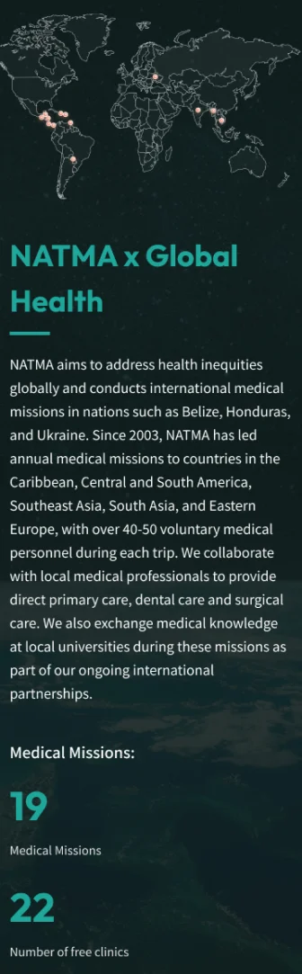 北美醫師協會(NATMA) 是一個由數千名台灣及台裔北美的醫師、牙醫師與其他醫療專業人員組成的專業組織。我們的工作以推動醫療進步、連結醫療專業人才、以及協助全球人群為宗旨。NATMA 為一個跨黨派、非營利的組織,創立於 1984 年,由一群熱忱的醫師與牙醫師於美國共同創辦。如今,我們的分會與會員遍布美國、加拿大與台灣。