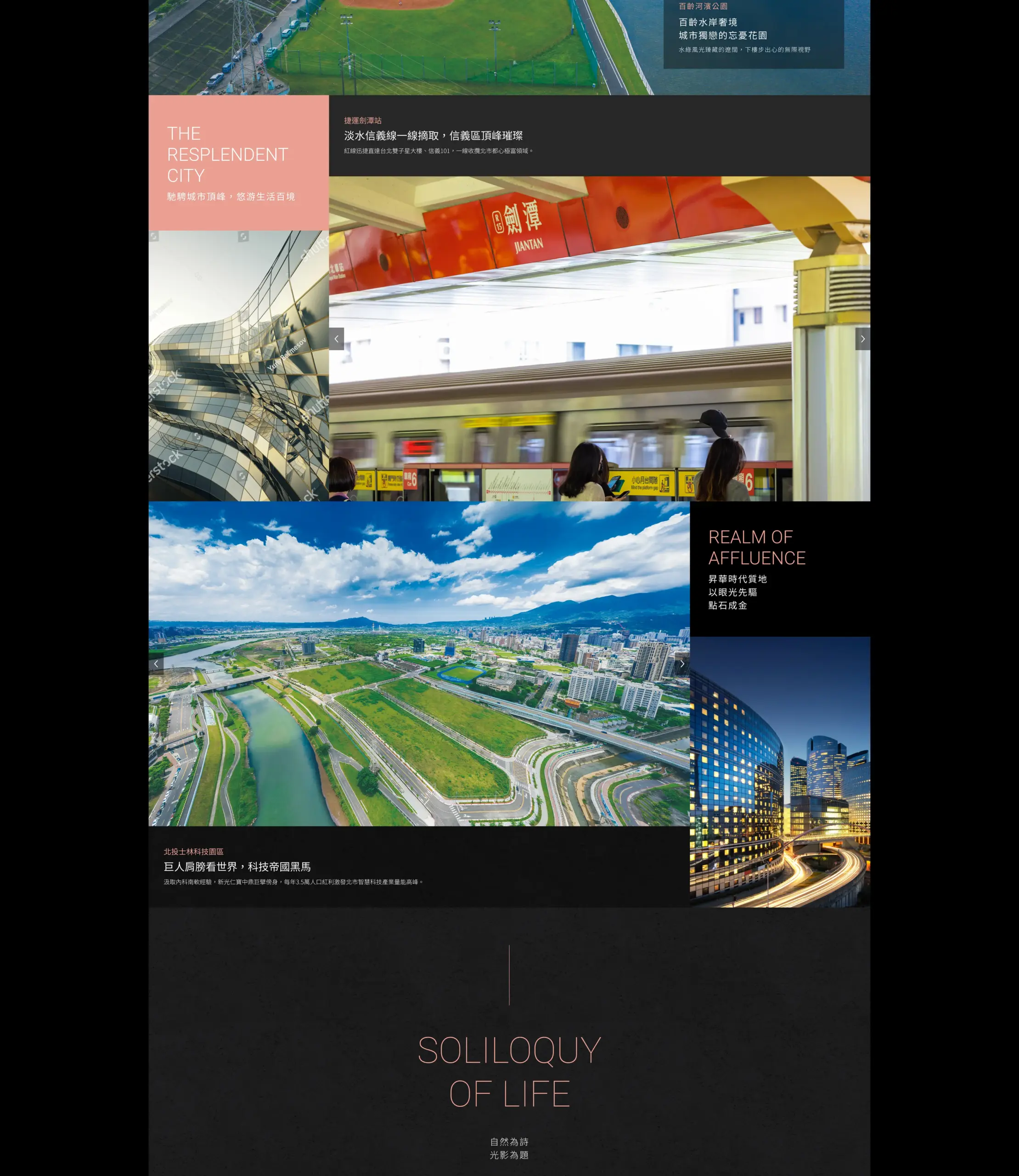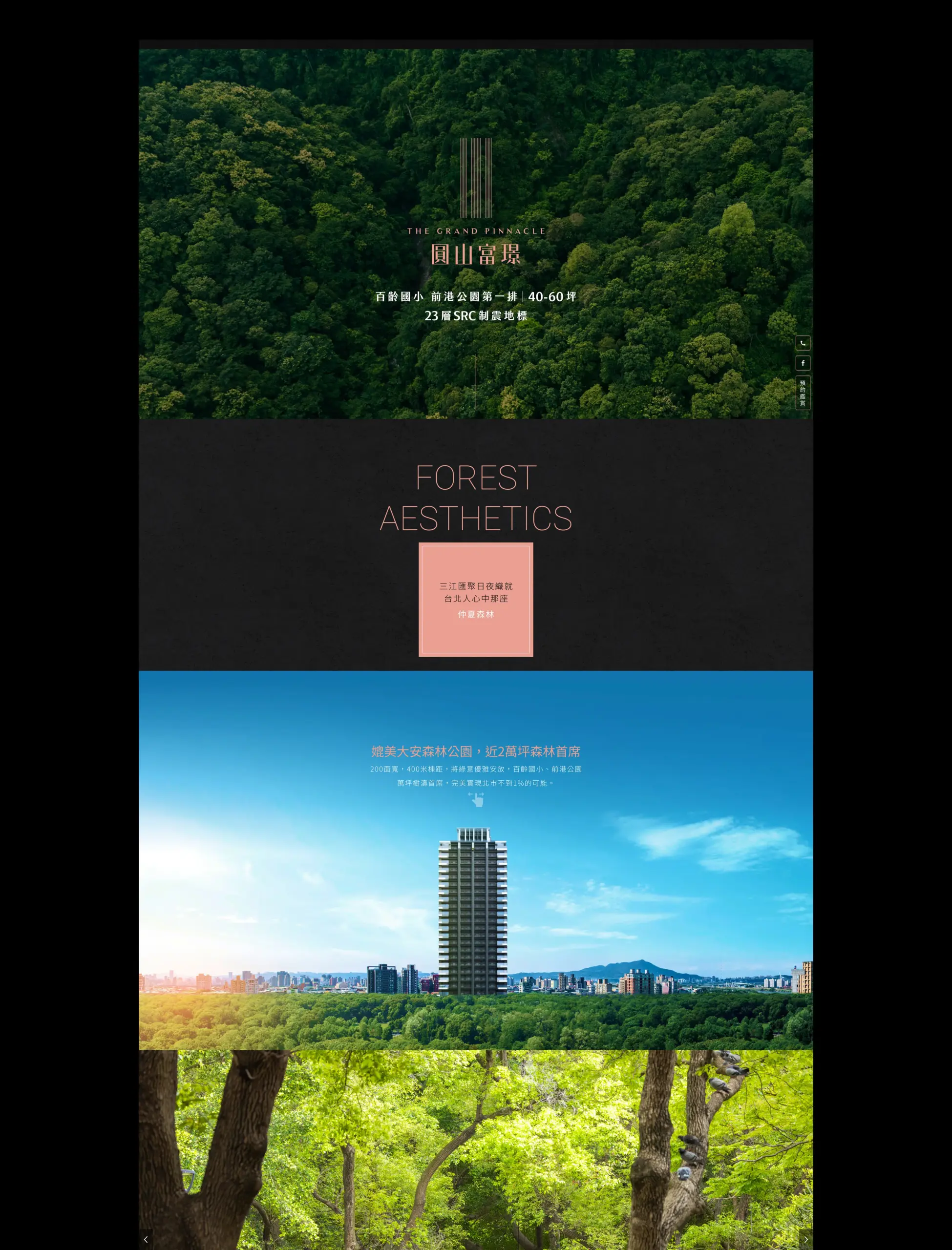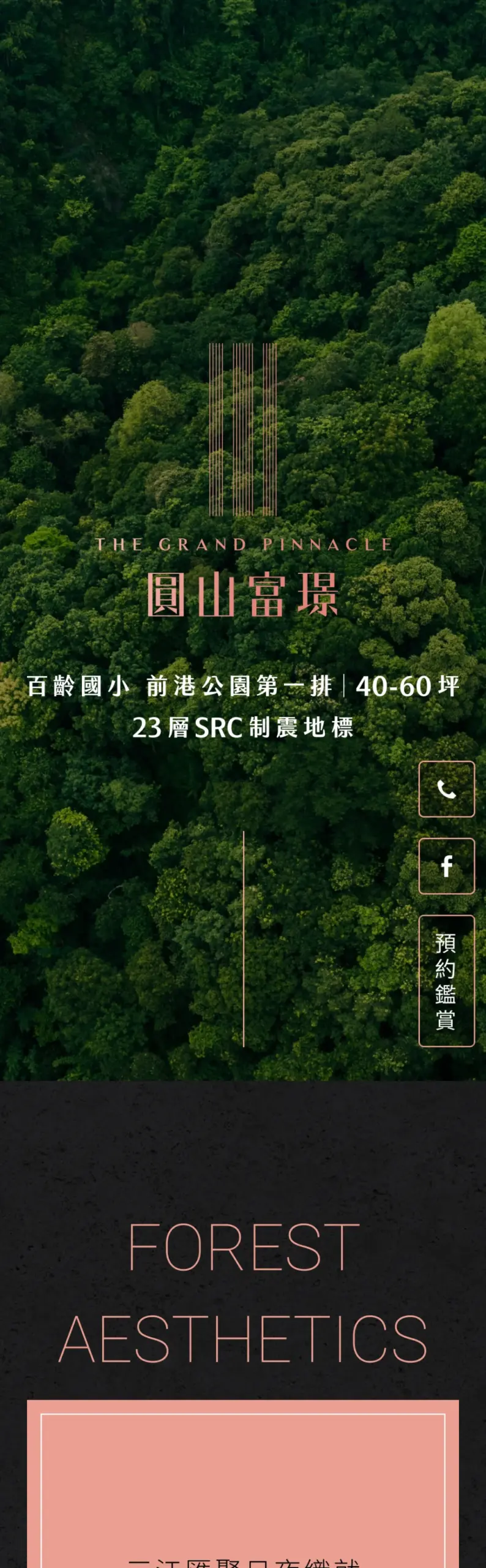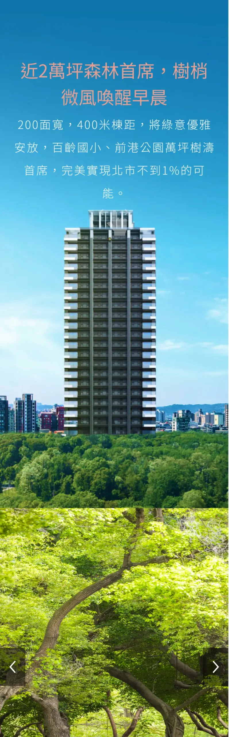 建議保留目前以大圖帶出高級感的表現,把「地段(校園/公園)」「安全(制震)」「配備(品牌清單)」三個重點段落化呈現,各段落用一張代表圖+一句概述,使讀者不用看完整頁也能在幾秒內抓到賣點;同時在頁尾或右側保留顯眼的「立即預約」或「查看其他案場」按鈕,讓即便案子已完銷的訪客也知道下一步如何接觸你們。
