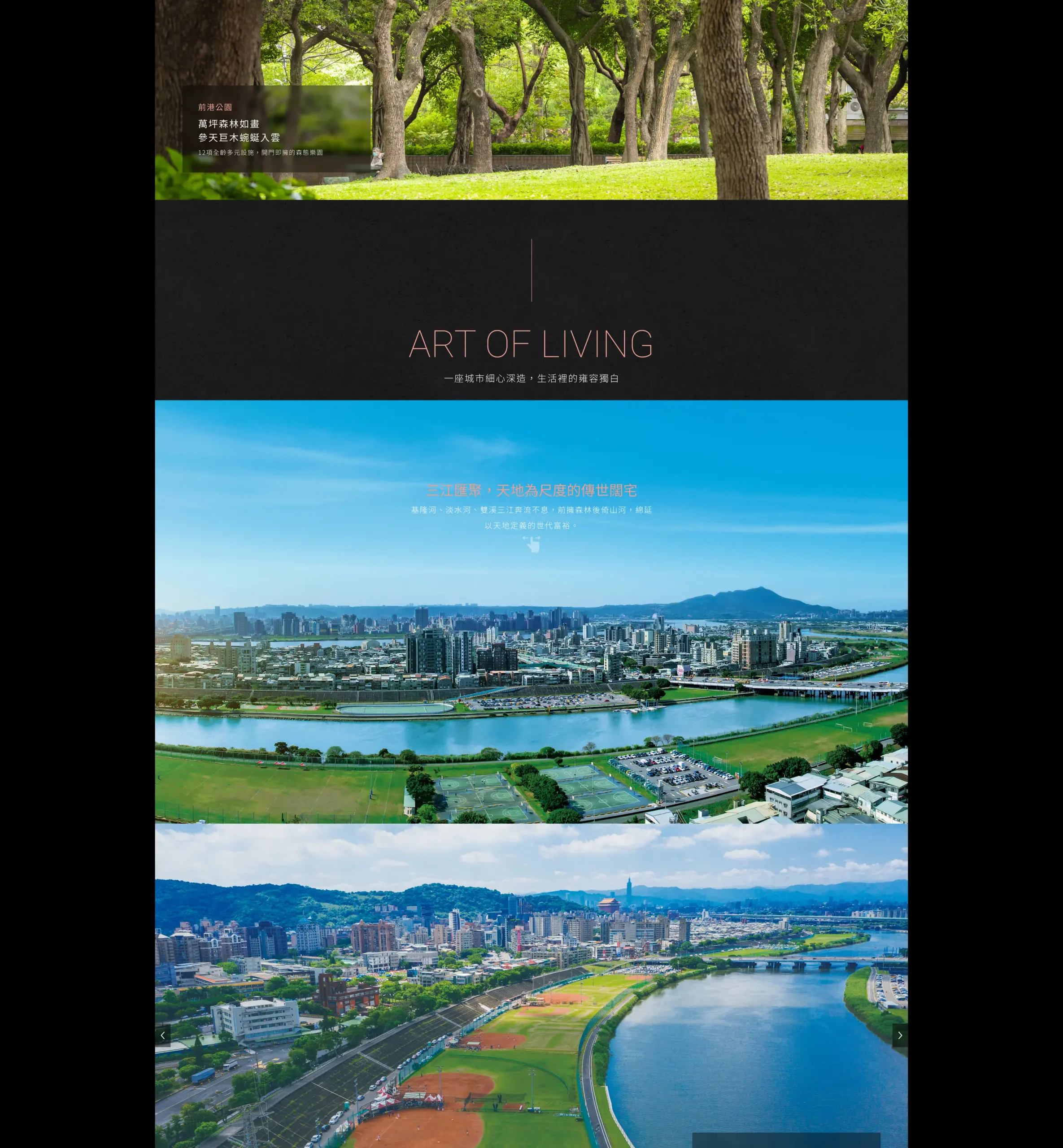 網頁從大場景(公園、河岸、周邊地標)切入,再往下展示建築設計、結構安全與室內配備,圖像為主、文字為輔的呈現方式讓訪客快速抓到地段與產品價值;最後以基本案場資訊、接待會館地址與預約表單做結尾,整體閱讀動線自然,適合一般消費者快速了解案子的重點與下一步該怎麼聯絡。