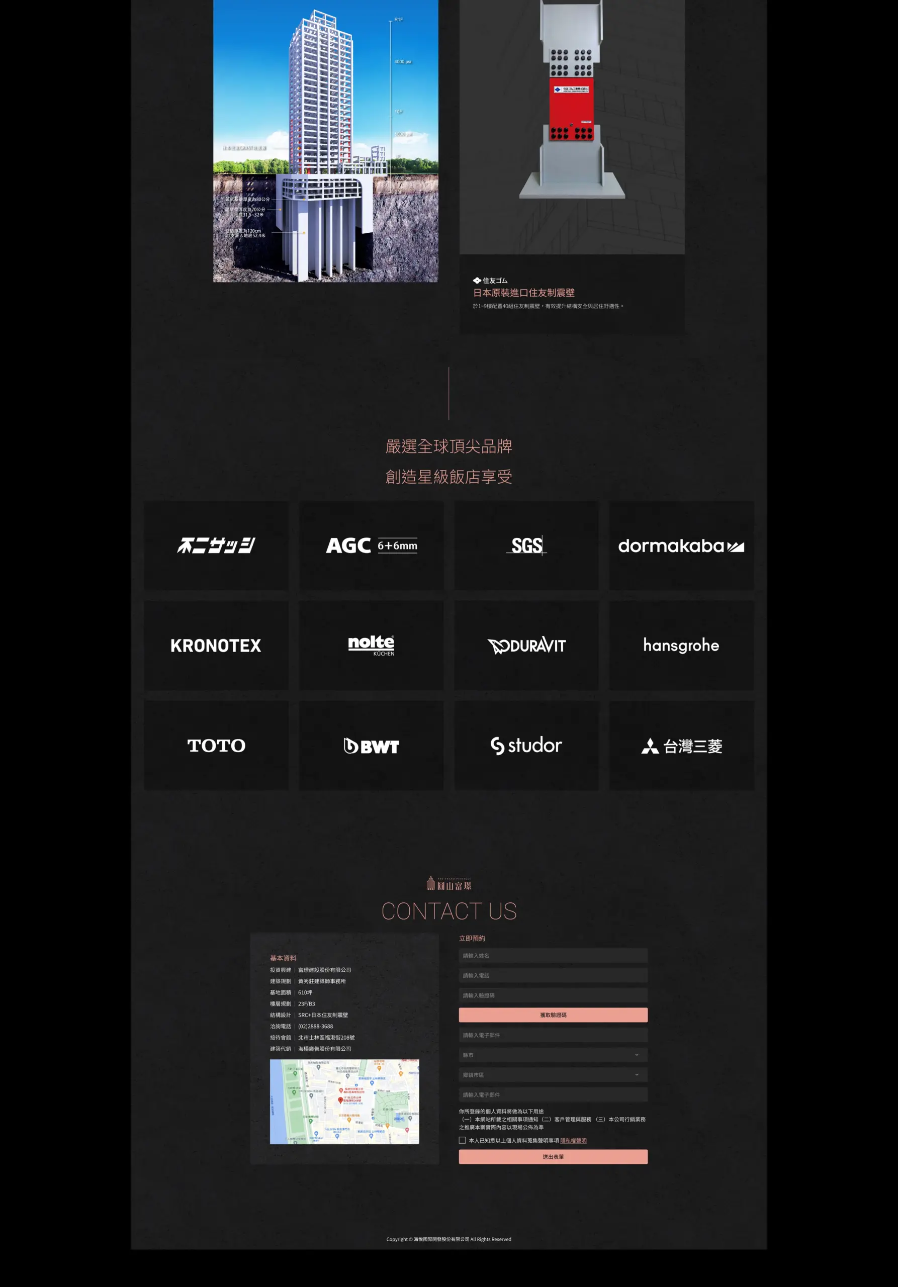 23 層的 SRC 結構與多項制震設計讓安全感可見,產品坪數以 40–60 坪為主,主打校園第一排與河岸、公園景觀;頁面同時列出國際建材與品牌配備(像是住友制震、德國廚具與衛浴、日本氣密窗、瑞士電子鎖等),讓人一看就能理解案子走的是「高規格、飯店級」的生活體驗。