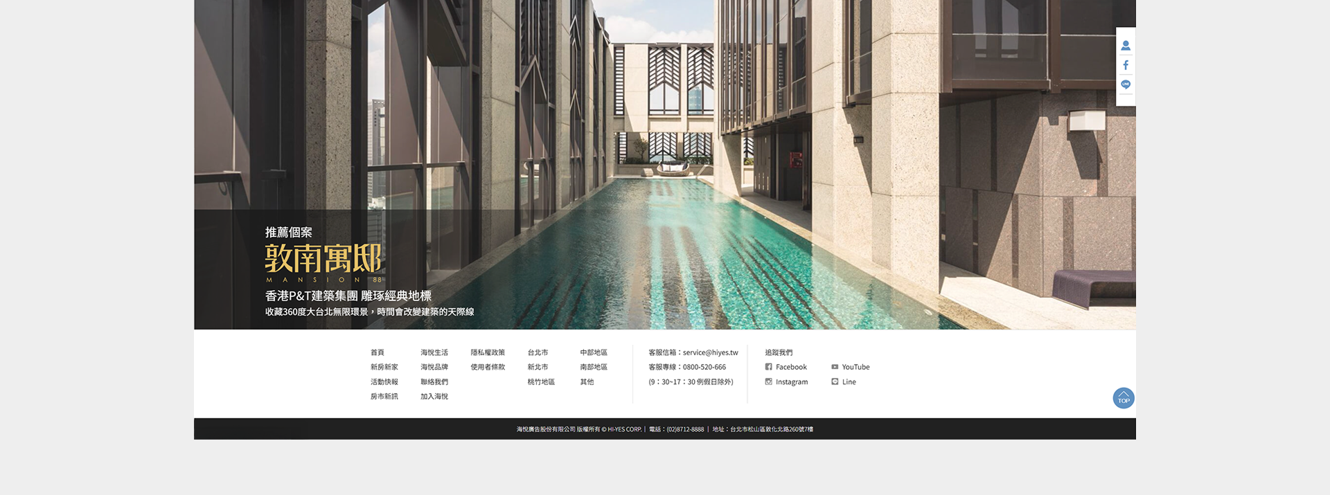 整體版面以沉浸式影像與文字節奏為主軸,視覺層次與空間感強烈。主視覺大圖與標題交錯融合,讓人一眼聚焦;「報名說明會」按鈕多次出現,持續引導行動。圖文的安排具有呼吸感,地段優勢區、品牌背景區、豪宅生活場景與具體數據區塊彼此串聯,卻又清晰分隔,閱讀體驗順暢。右下角全年無休的智慧客服更增添即時互動功能,強化使用者感受與服務可及性。整體風格簡約、優雅、功能分明,兼顧美感與商業目的。