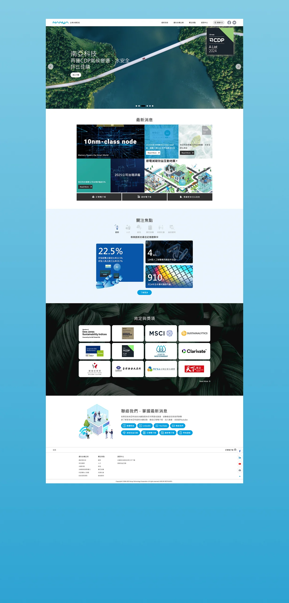 在版面規劃上,網站採模組化的區塊設計,每一段都具備明確的標題、對應圖像與行動按鈕,搭配一致的科技藍色調與簡潔線條,營造出理性、可信賴的視覺風格。
