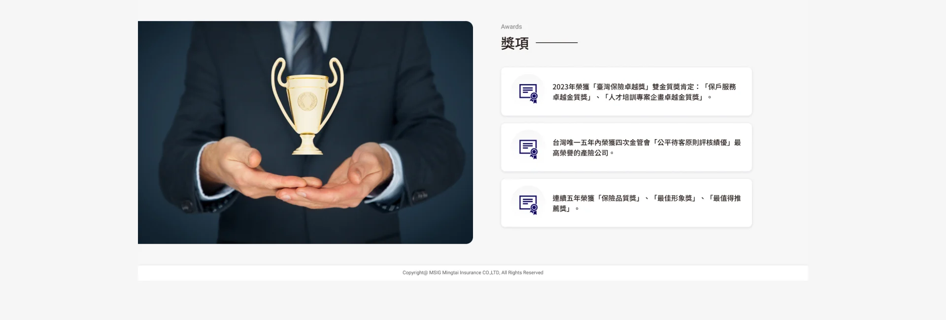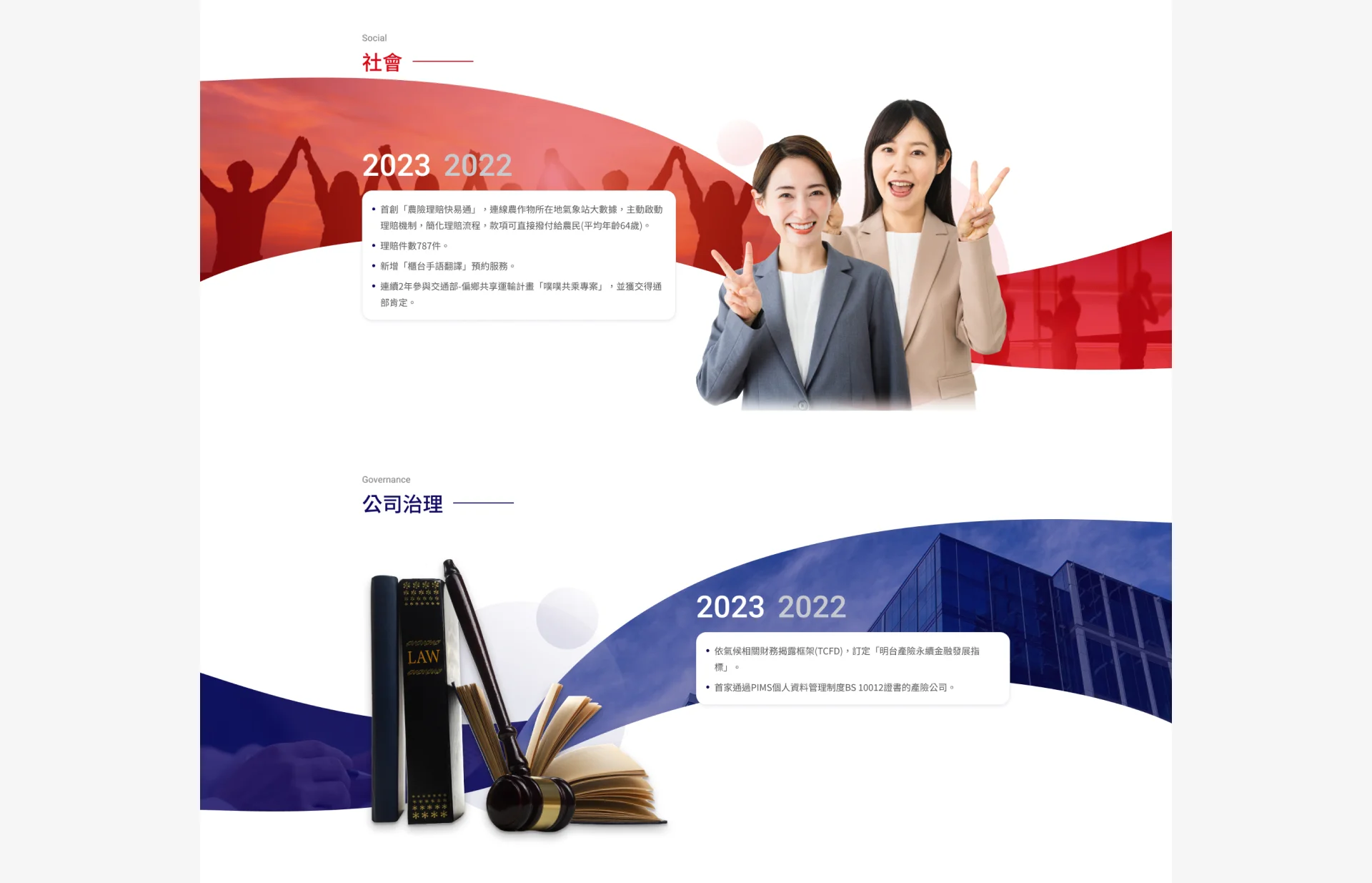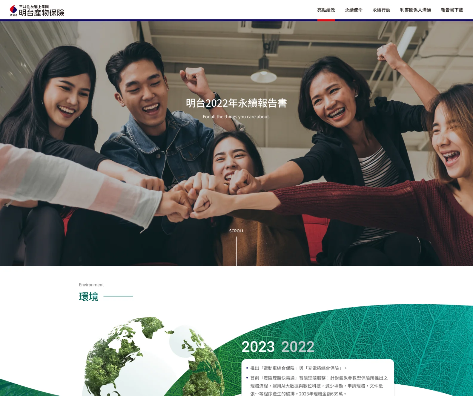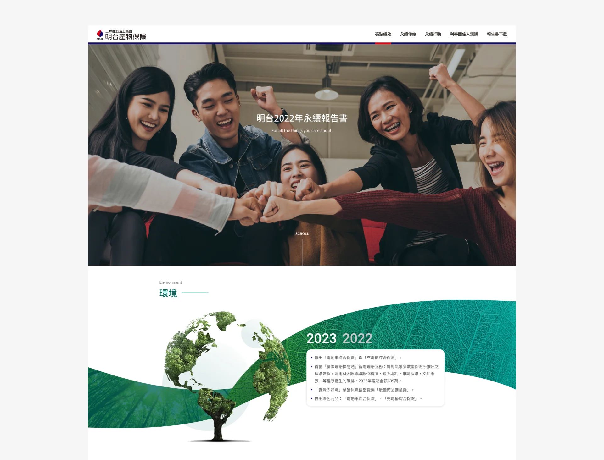 延續品牌藍紅色系曲線元素,並巧妙加入綠色作為環境保護的視覺代表,搭配紅色象徵社會責任與藍色代表公司治理,三種顏色融合於流暢的曲線設計中,營造出動感且具辨識度的品牌形象。頁面架構清晰,以分段方式呈現環境保護、社會責任及公司治理三大面向,搭配代表性圖片,提升資訊易讀性與視覺吸引力。支援響應式布局,確保在手機、平板及桌機等多種裝置上皆有良好瀏覽體驗,展現明台產險對永續發展的重視與具體行動。