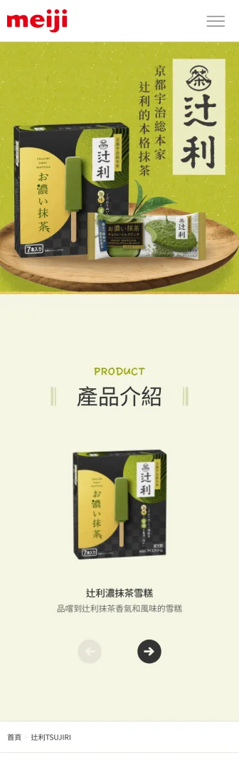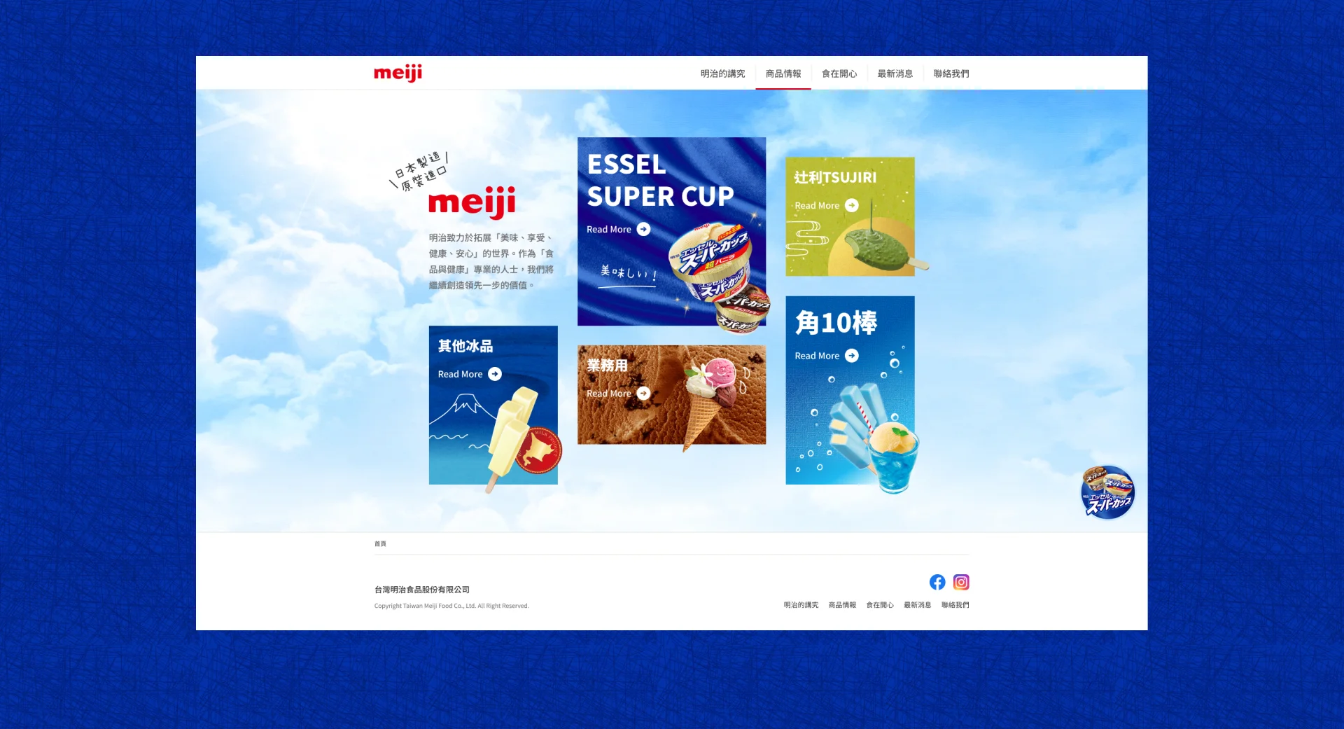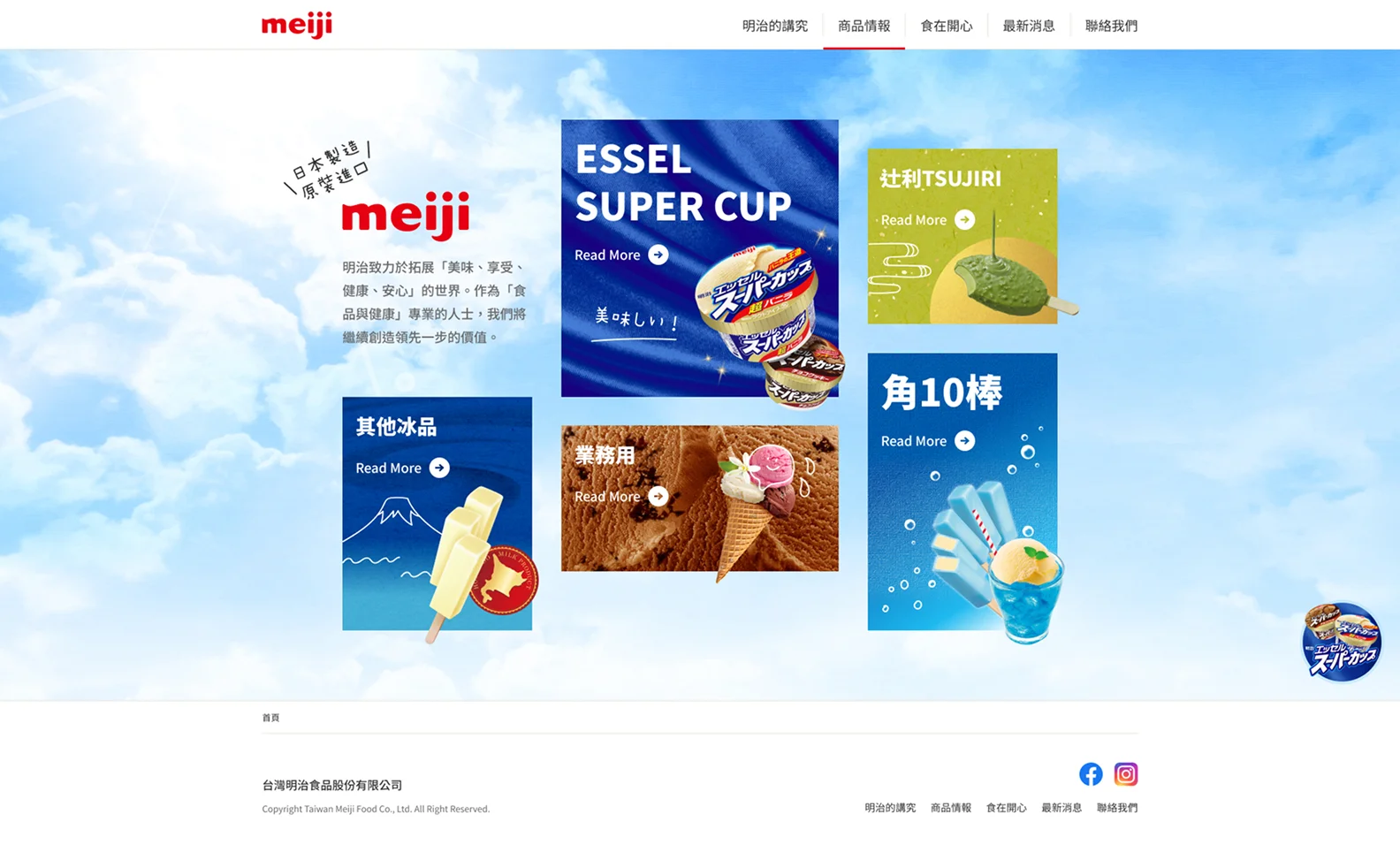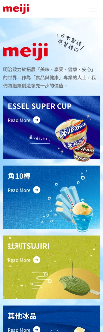 核心重點放在五大商品系列的呈現。首頁開場以藍天白雲與品牌標誌營造清爽夏日氛圍,搭配簡短的品牌理念文字,傳遞「美味、享受、健康、安心」的價值。接下來的主要區塊直接呈現五大商品系列,並以清晰的圖像與名稱作為入口,方便使用者立即理解並點擊進一步探索。各系列的商品圖搭配「Read More」的導引設計,提供清楚的資訊層次與瀏覽動線,讓訪客能快速掌握明治冰品的多樣化選擇。
