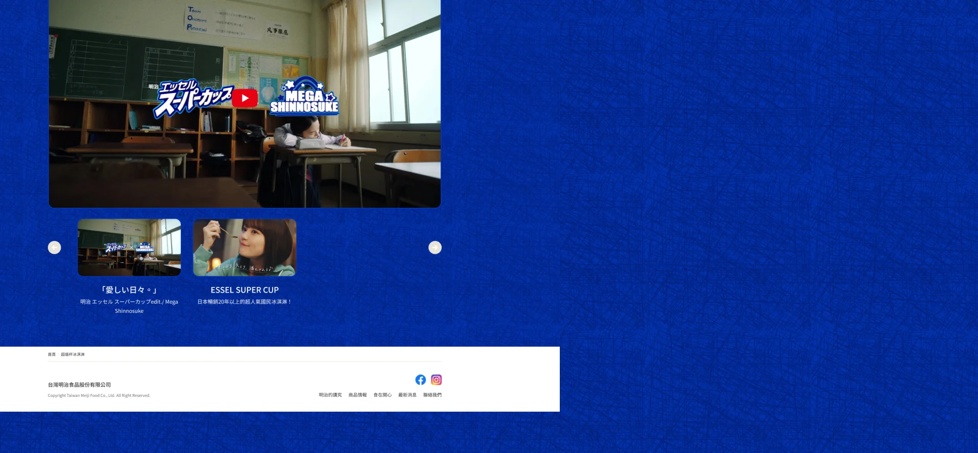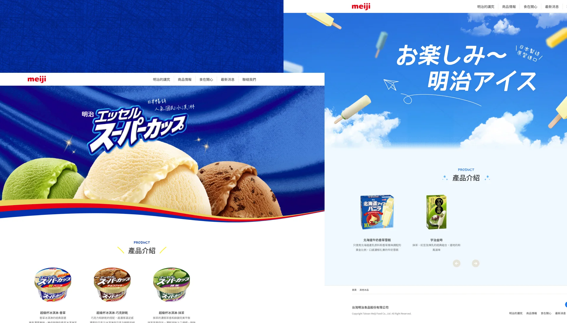在五大商品系列的版面設計中,運用了破圖與不規則排列的手法,讓每個系列各自獨立卻又彼此串聯,使訪客能在第一時間同時瀏覽所有品項。這樣的排版不僅跳脫傳統的方整格狀,還帶來活潑、多變的視覺節奏,強化了探索的趣味感。整體氛圍以清新明亮的藍天與夏日色彩為基調,搭配大膽的商品影像,營造沁涼清爽的印象,呼應冰品的季節感。視覺上的動態感與多元元素,讓介面不僅僅是瀏覽商品,而是一場視覺上的體驗旅程。透過這樣的設計,使用者能感受到明治冰品的多樣化與獨特魅力,同時拉近品牌與消費者的情感連結,使整體網站更具互動性與吸引力。