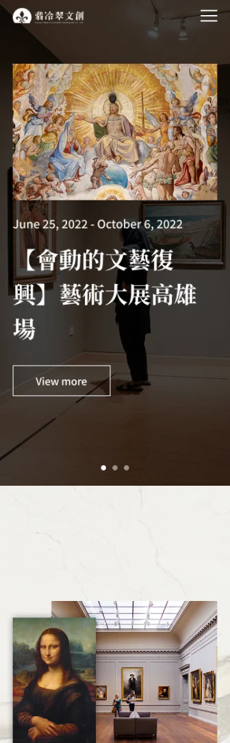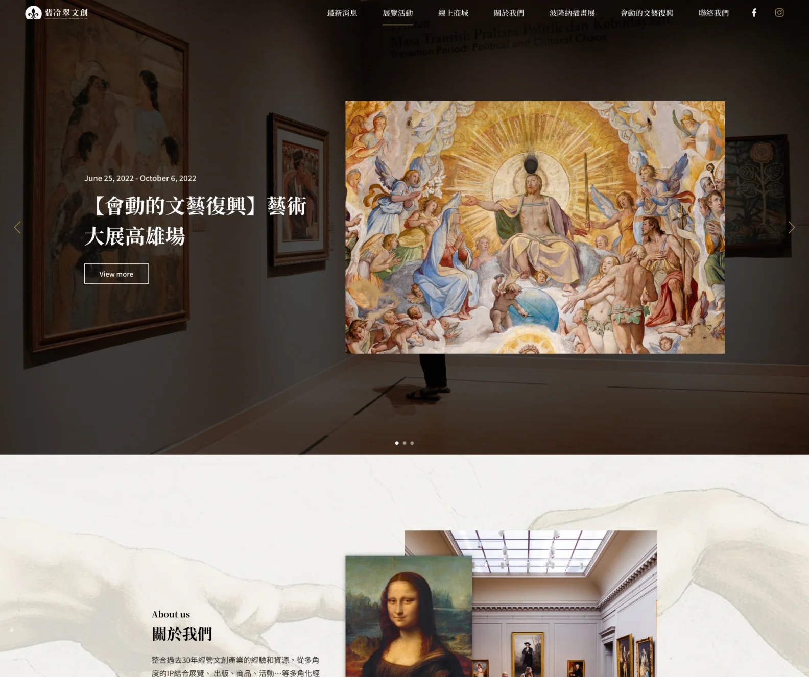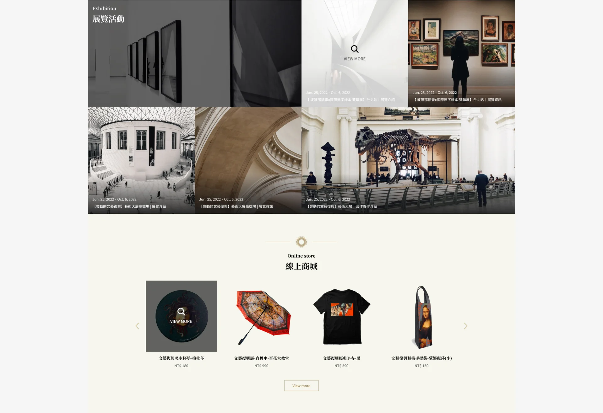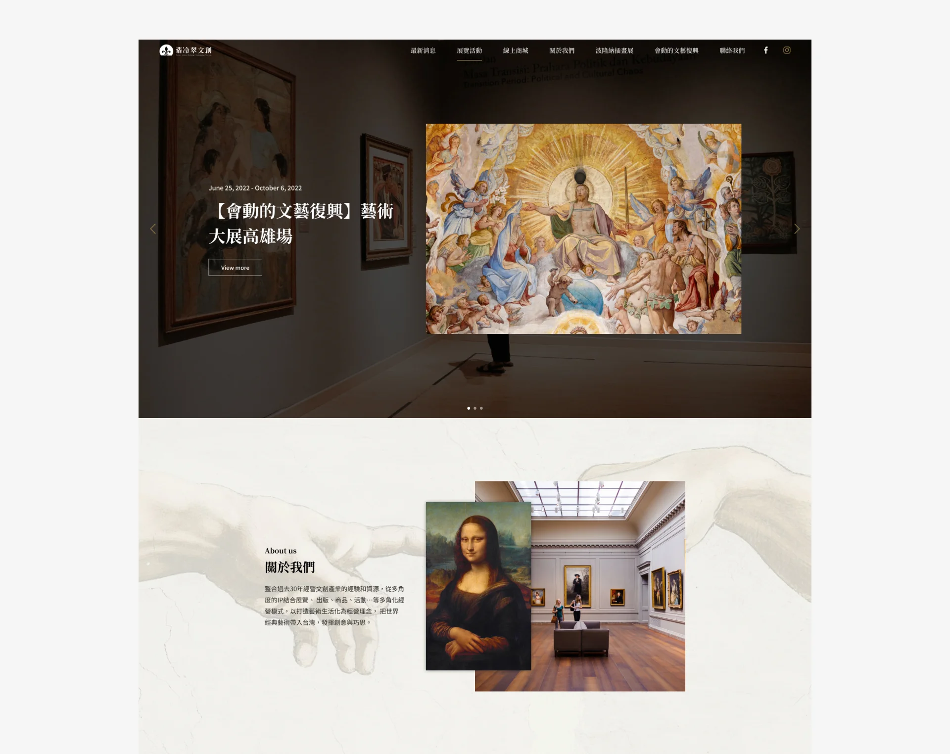 以「藝術沉浸體驗」為核心,透過視覺強烈的展覽圖片和動態效果,營造出身臨其境的感受。首頁以大型橫幅展示當前展覽,並搭配簡潔的文字說明,讓訪客一目了然。整體色調以藝術展覽常見的深色系為主,突顯藝術品的細節與氛圍,並透過動態元素提升互動性,使網站不僅是資訊平台,更是藝術體驗的延伸。