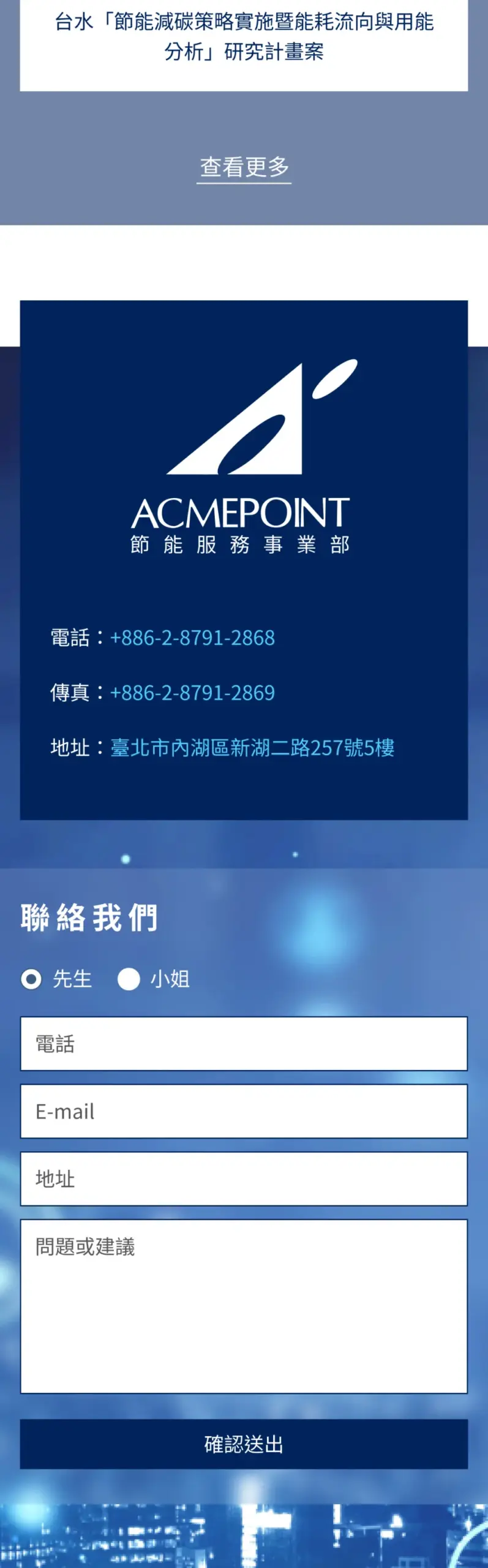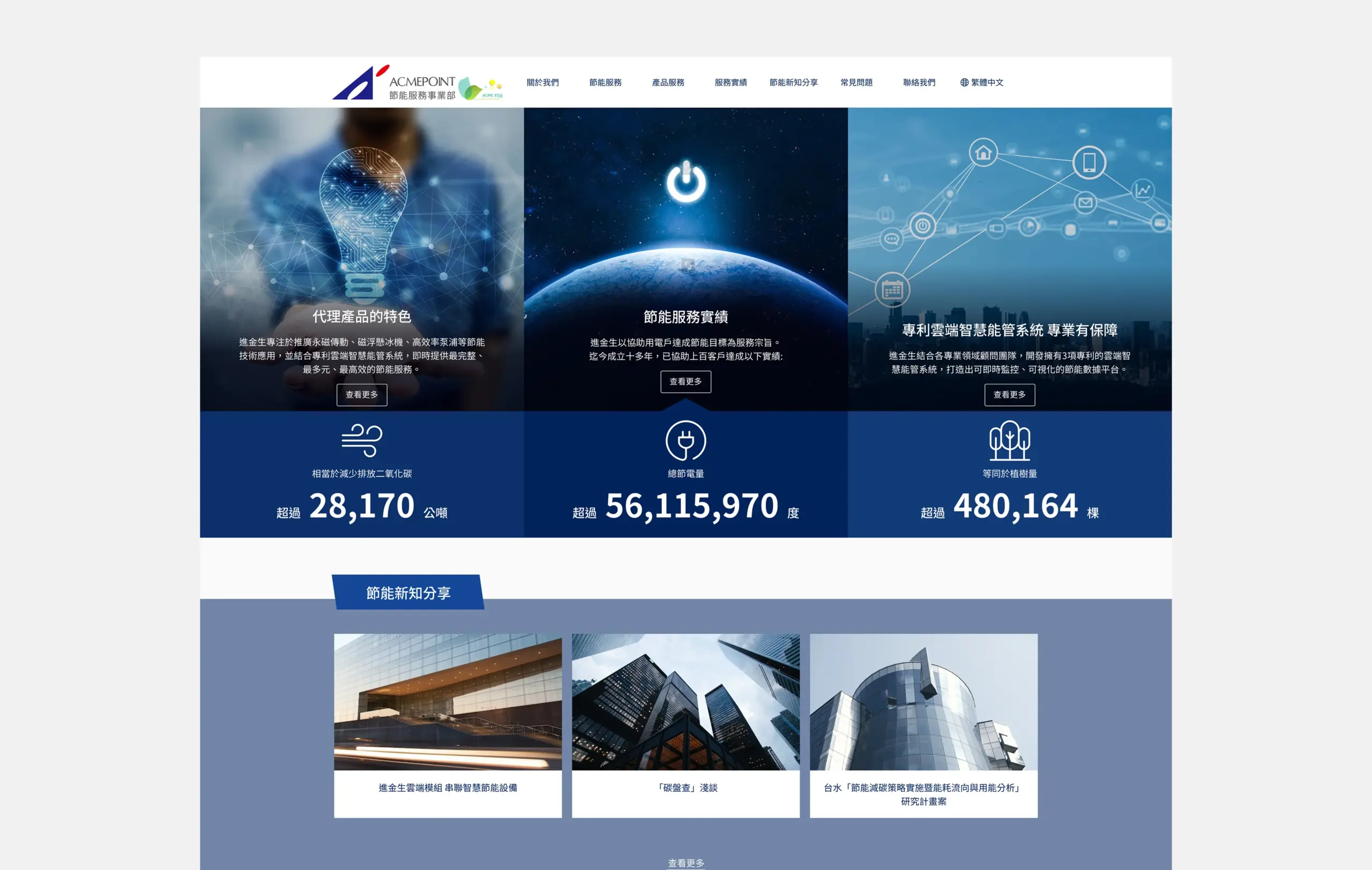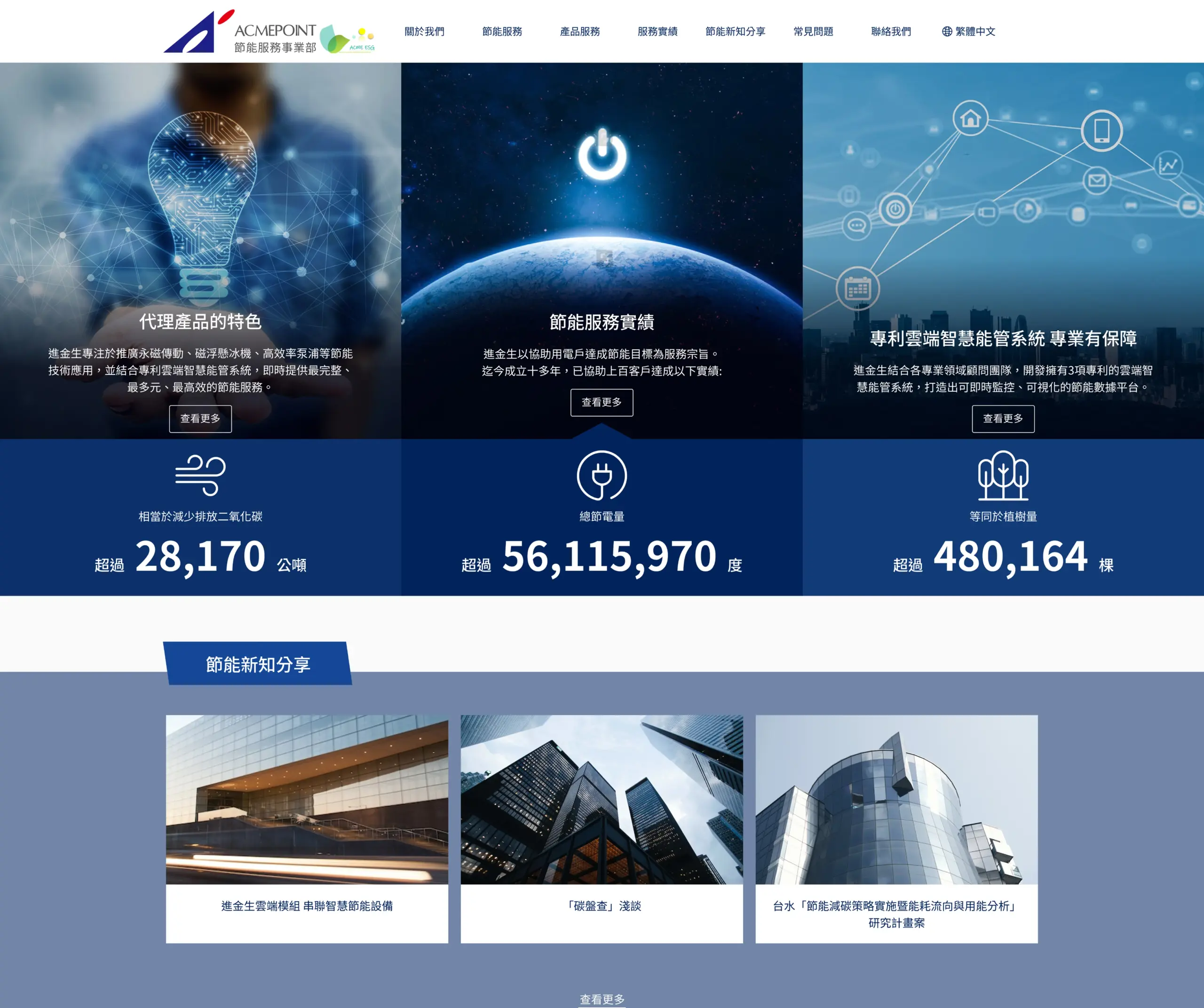 網站的資訊從簡短的公司定位出發,接著分成服務項目、實績與節能知識分享幾大區塊,文章與案例以淺顯語句搭配圖片呈現,讓非專業的訪客也能一步步從「我需要節能」到「他們能怎麼幫我」的邏輯理解服務內容;同時在頁面底部放上聯絡方式與社群連結,方便客戶在確認需求後立即取得聯繫。