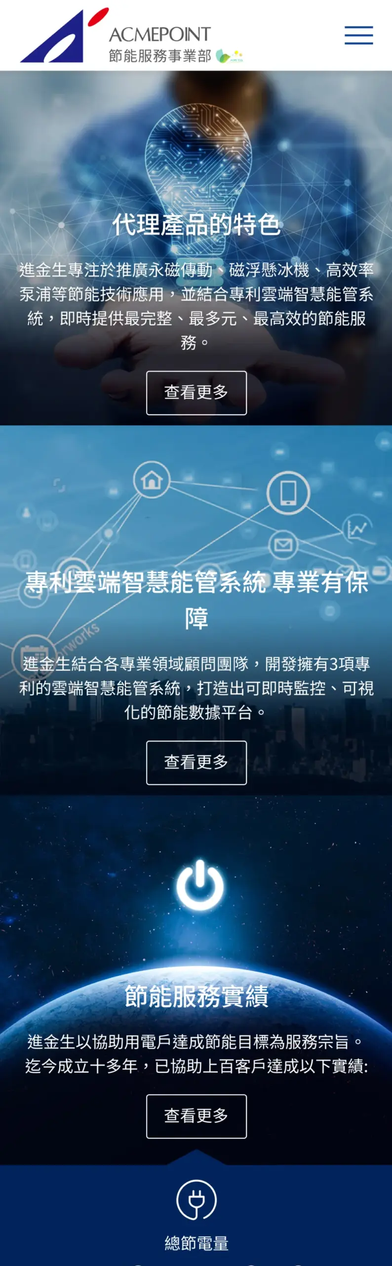 進金生為 ACME 集團旗下的永續發展事業部,網站以「節能、減碳與能源管理」為核心訴求,向訪客說明公司多年協助公用設施與工廠降低能源消耗的經驗與服務範圍;首頁以簡潔的文字和圖片呈現公司提供的水處理、工廠與商辦大樓節能解決方案,以及碳管理等服務,讓第一次來到網站的客戶能快速了解這家公司是做節能與能源可視化的專業團隊。