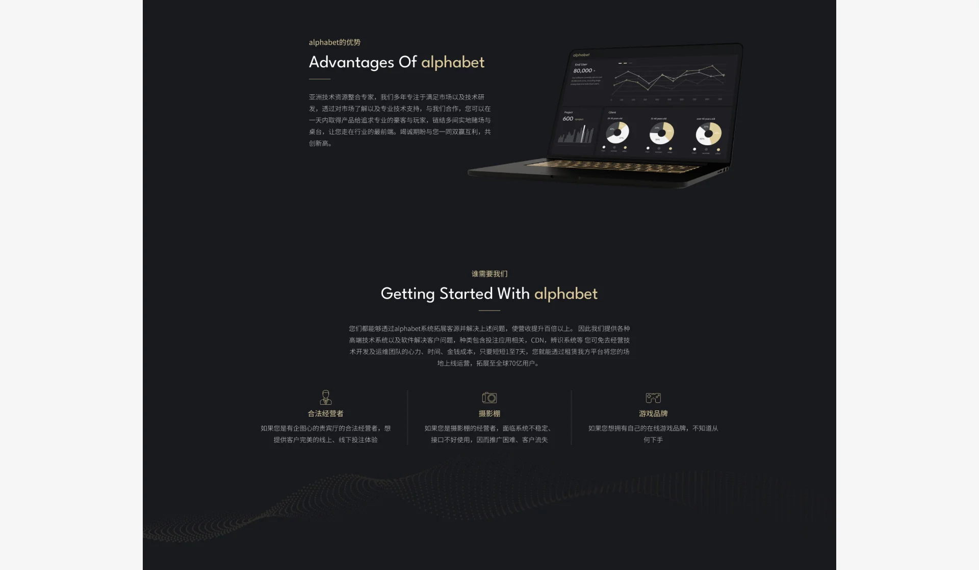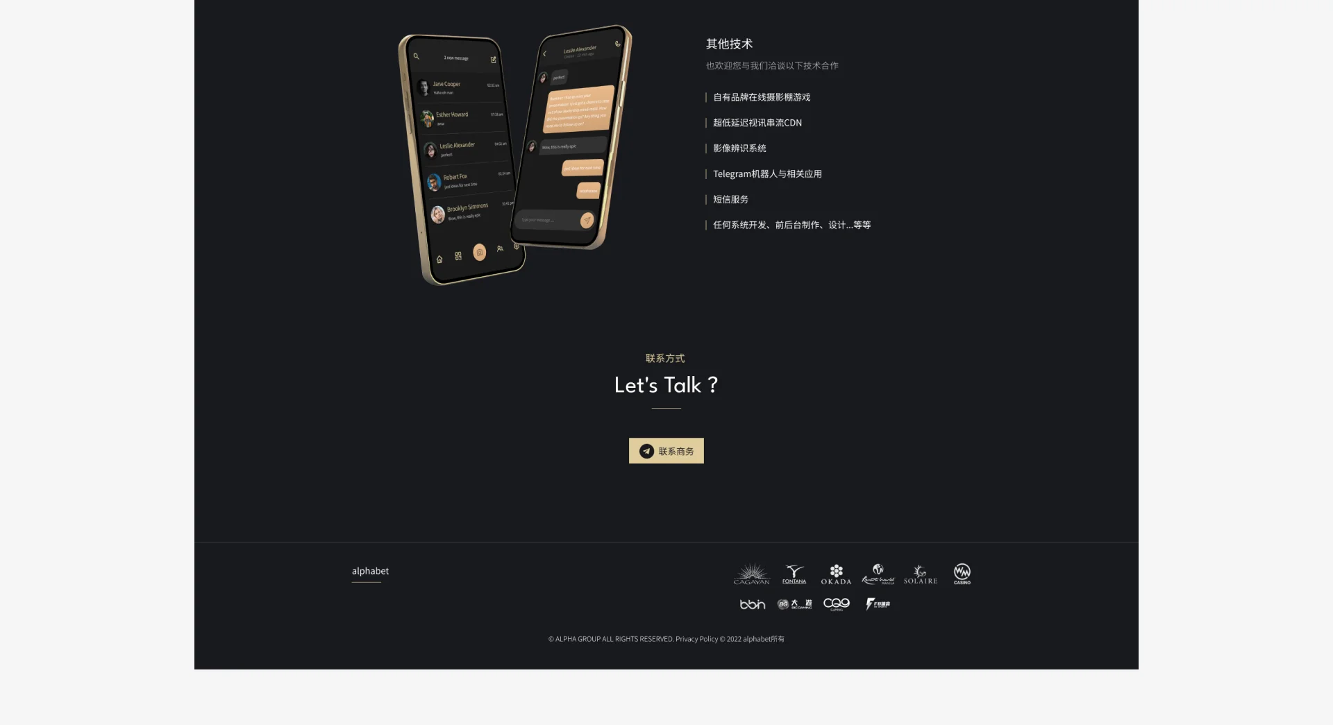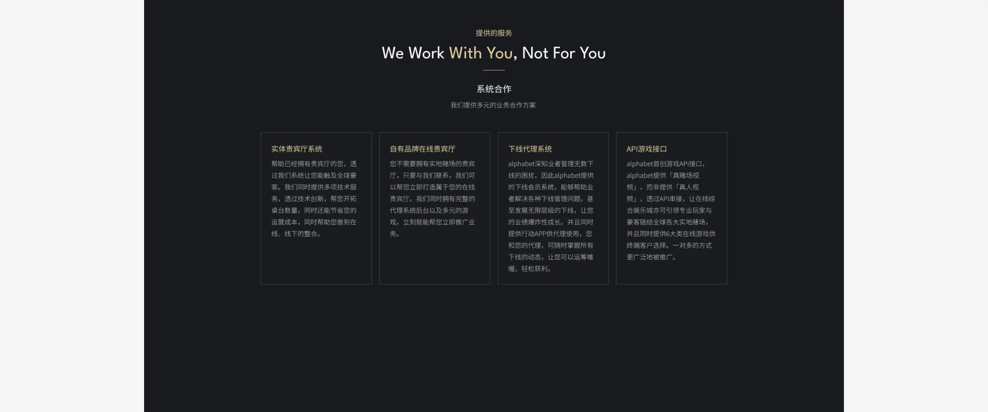 alphabet從用戶需求出發,十年來與合法牌照實地賭場深耕合作,協助客戶打造公信力最高的遊戲平台,同時支持在線與現場的多種遊戲,已成為貴賓廳豪客、專業玩家的首選。全球多間實地賭場皆有與alphabet長期合作,所有alphabet賭場視頻遊戲皆會在現場實際下籌碼,打造一個親臨現場的環境,玩家可隨時到全球合作的娛樂城參觀檢驗。