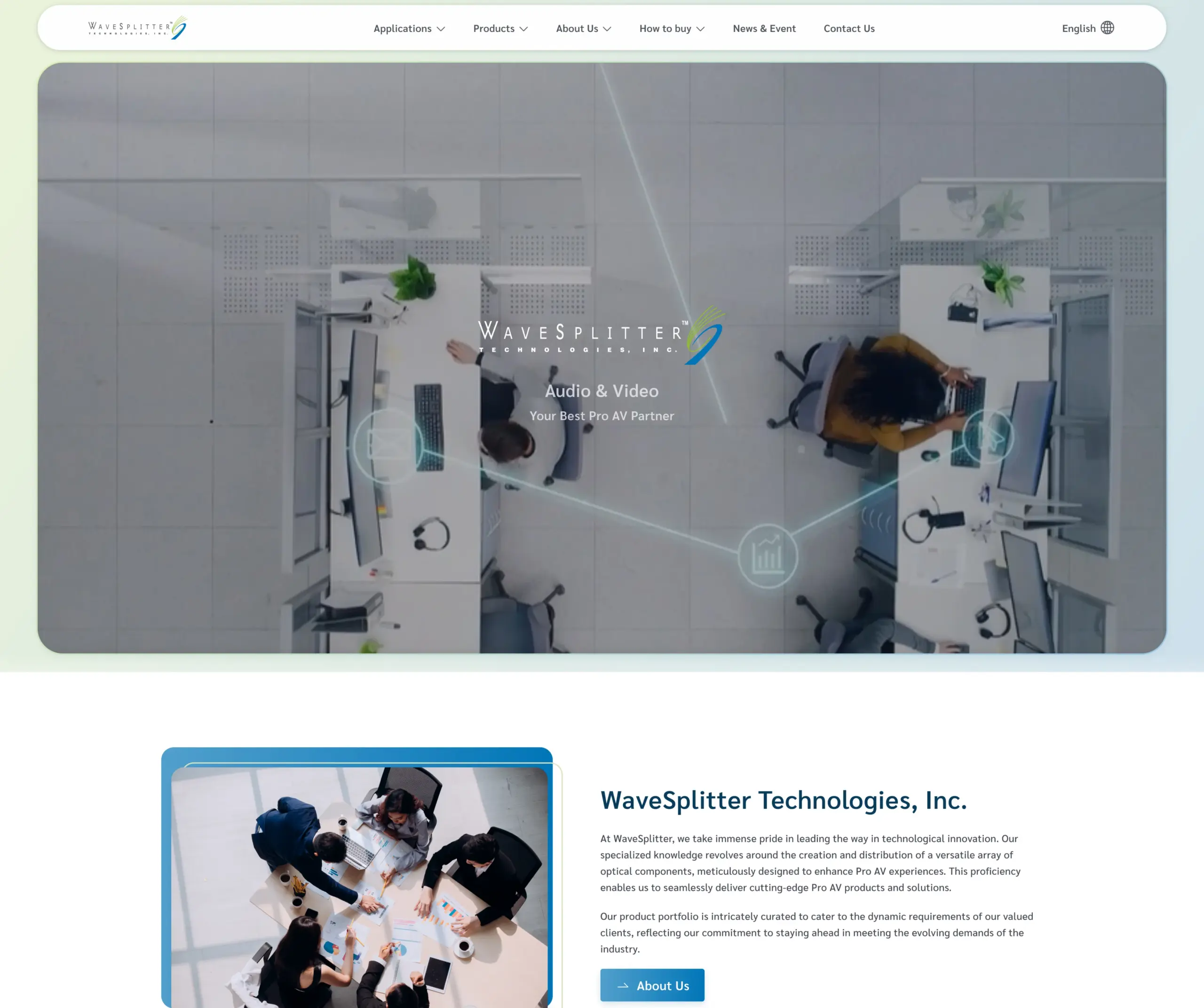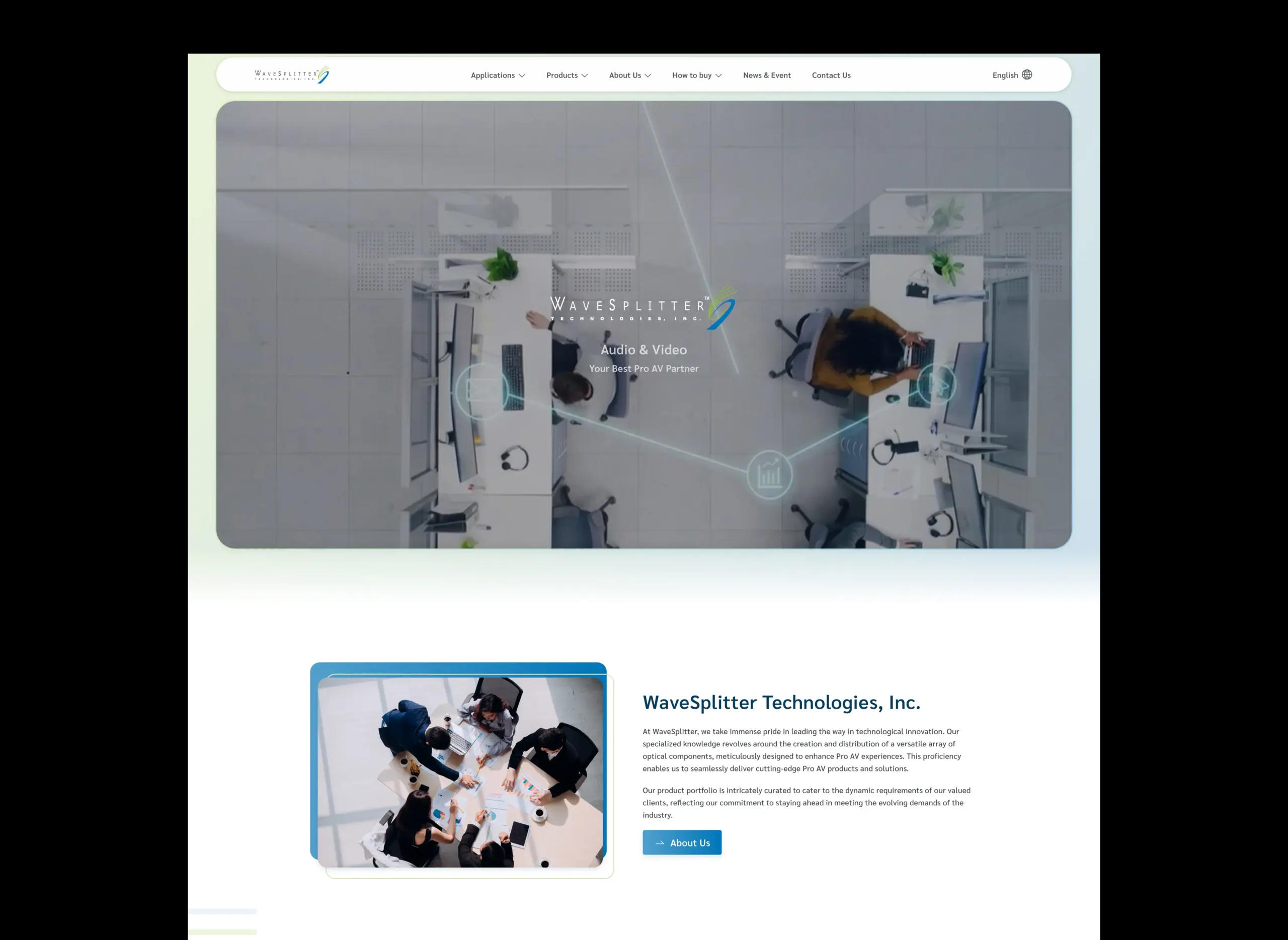 WaveSplitter定位為專業 Pro AV 解決方案供應商,專注於光纖與視訊傳輸技術,網站以「Your Best Pro AV Partner」為主題語,呈現從 AV over IP、延伸器(HDMI、USB)到影像處理器、矩陣切換與光纖線材等整套產品線,並在 About 與 Global Locations 區塊強調公司歷史、核心價值與全球據點,整體語氣傳遞技術深度與商業可用性。