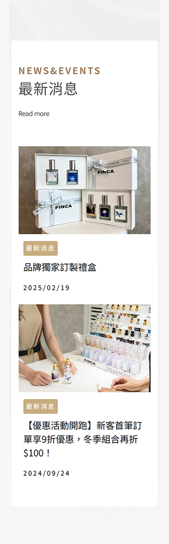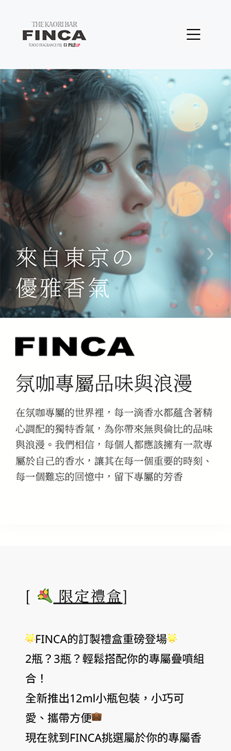 FINCA是一個來自日本東京的香水品牌,以「香氣為你創造獨一無二的記憶」為核心理念。品牌致力於調配多層次的獨特香氣,讓每個人都能找到專屬於自己的味道,並透過香氛展現個人魅力與自信。