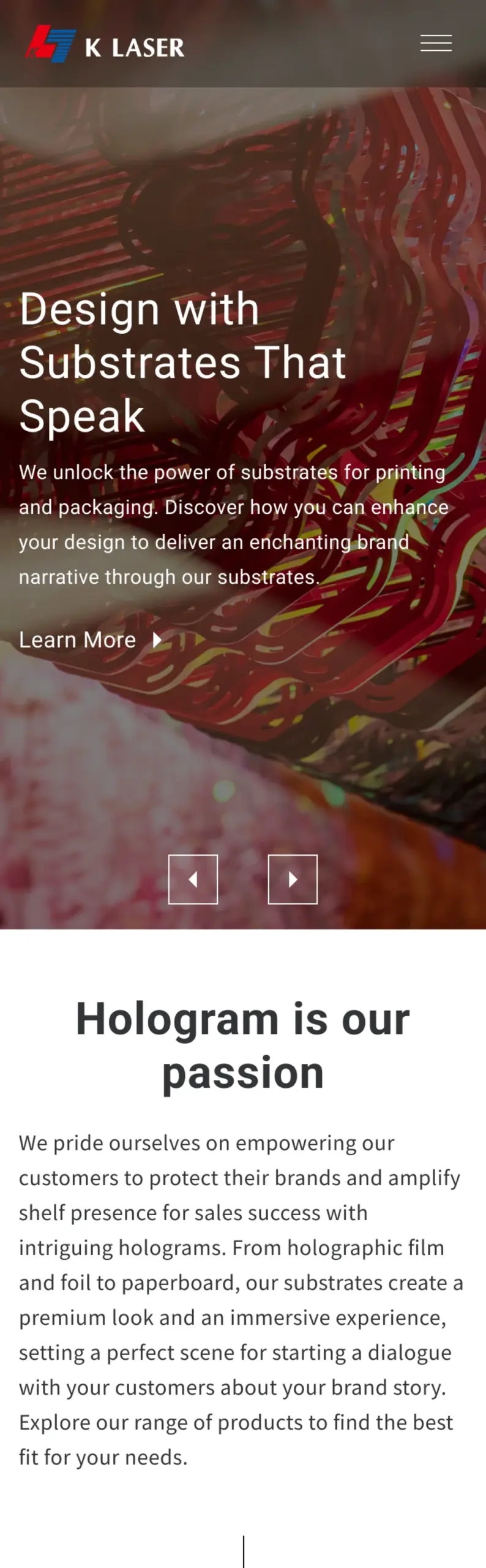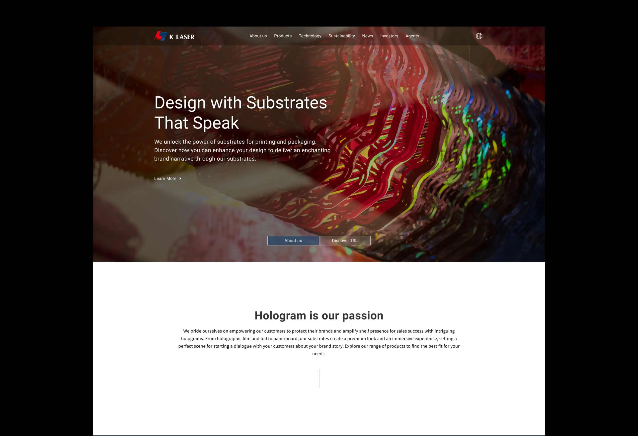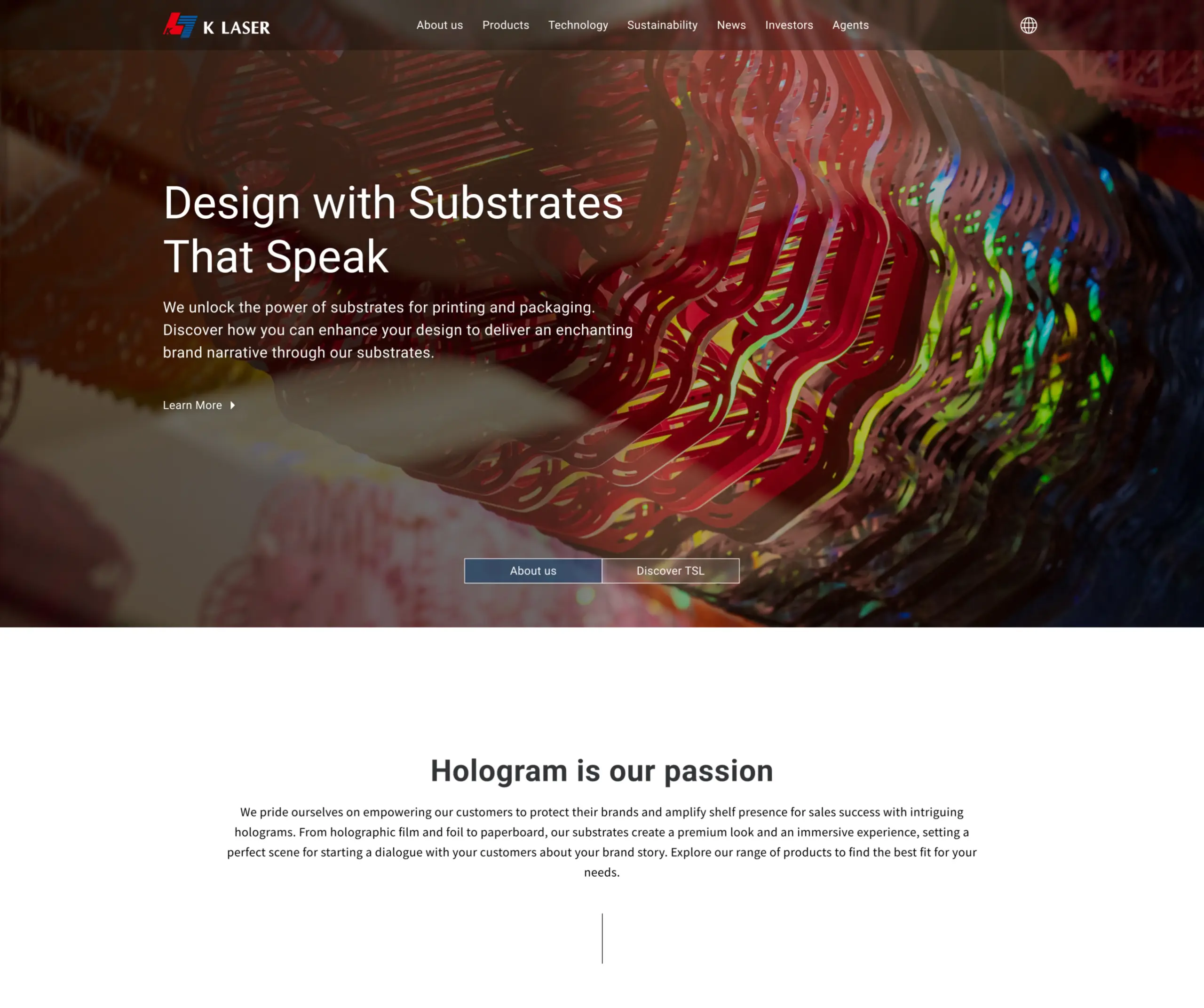 K Laser 是一家專注於全系列「讓商品更吸睛也更安全」的公司,主要製作能在包裝、標籤與宣傳上產生視覺效果或防偽功能的全光學材質,例如全息薄膜、金屬光澤紙板等;網站以直觀的視覺語言與應用場景說明品牌如何幫助商品在貨架上突顯(或防止被仿冒),並同時說明公司遍布多地的生產與服務據點,讓人一目了然這是一家具備產品供應與全球服務能力的製造型企業。