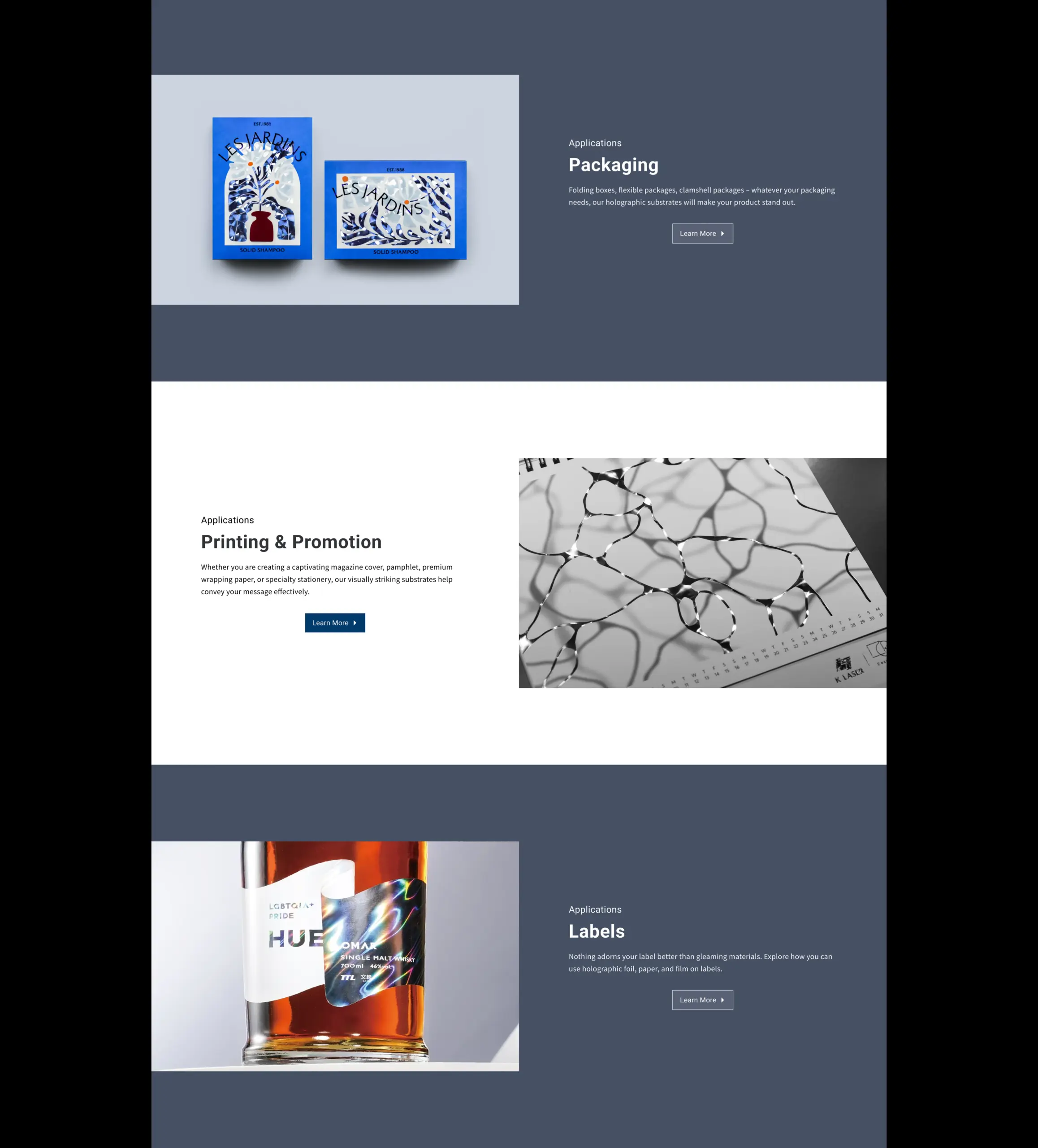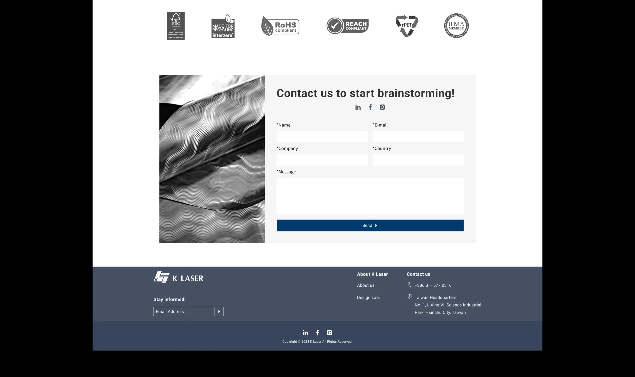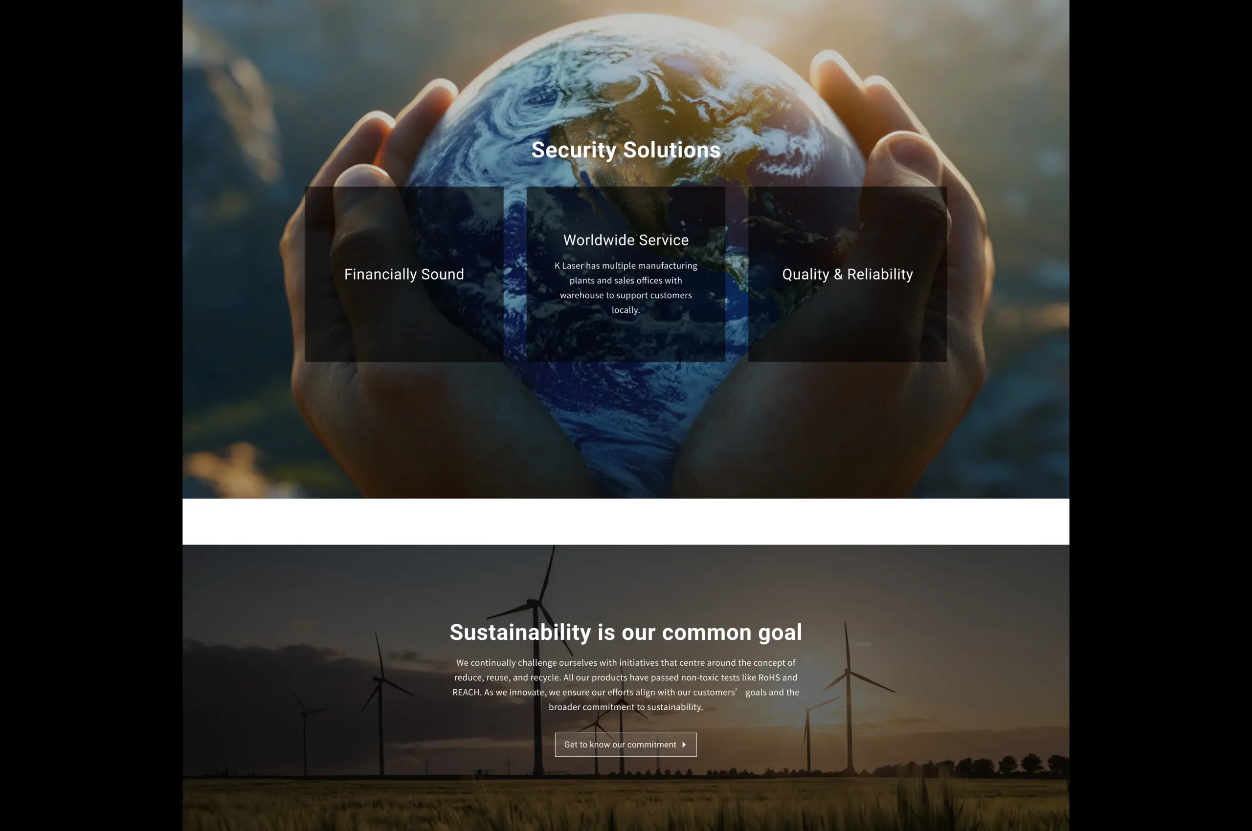 K Laser 是一家專注於全系列「讓商品更吸睛也更安全」的公司,主要製作能在包裝、標籤與宣傳上產生視覺效果或防偽功能的全光學材質,例如全息薄膜、金屬光澤紙板等;網站以直觀的視覺語言與應用場景說明品牌如何幫助商品在貨架上突顯(或防止被仿冒),並同時說明公司遍布多地的生產與服務據點,讓人一目了然這是一家具備產品供應與全球服務能力的製造型企業。