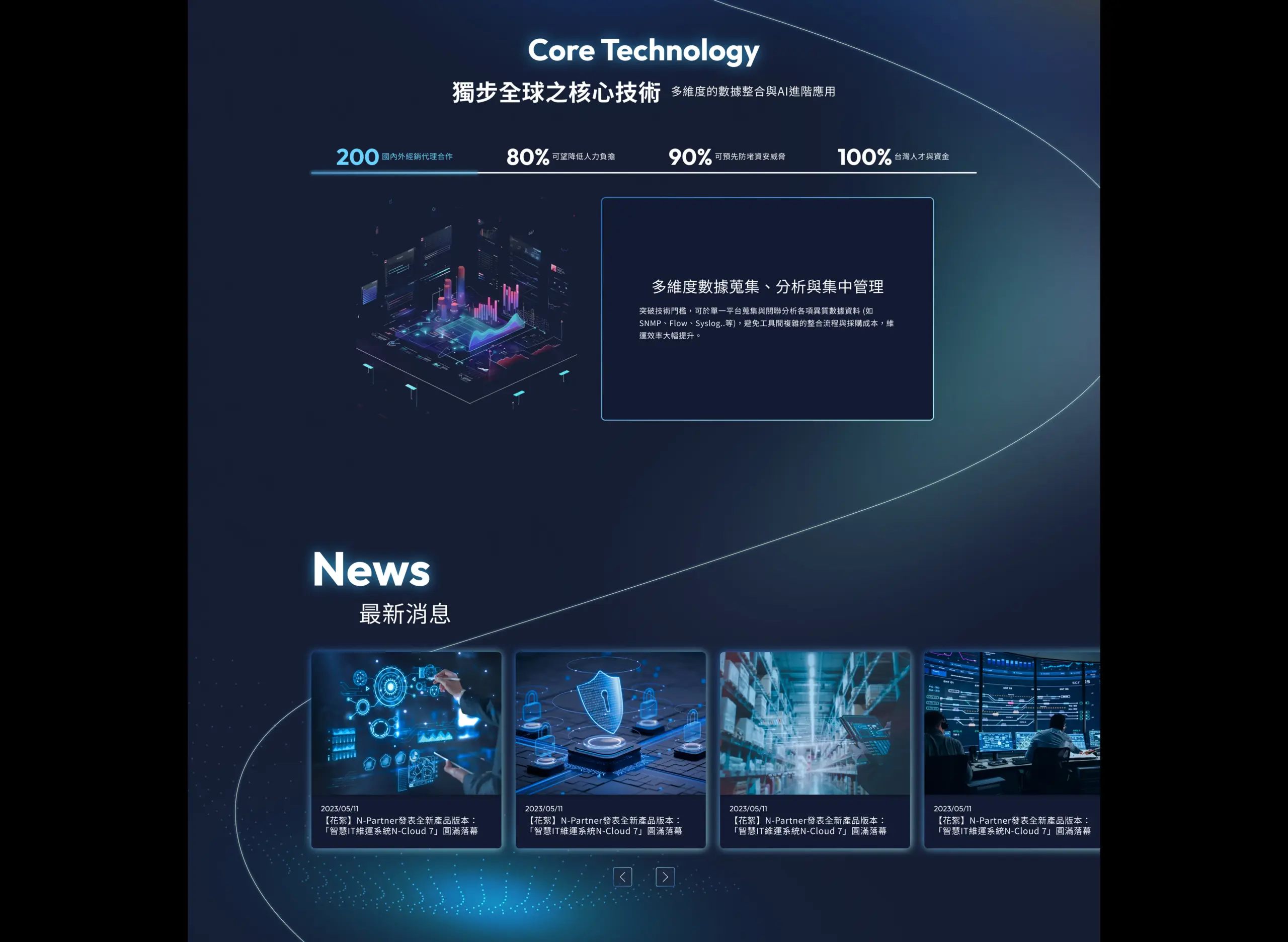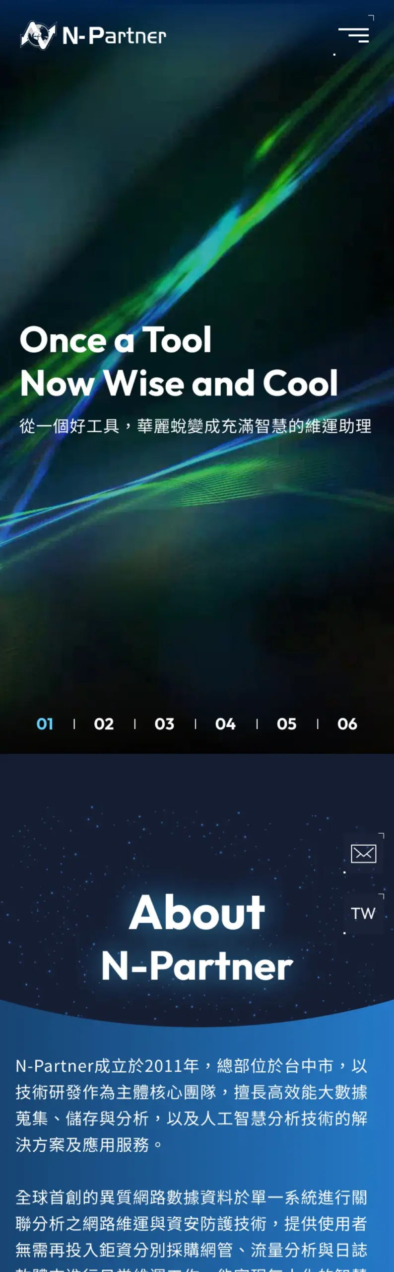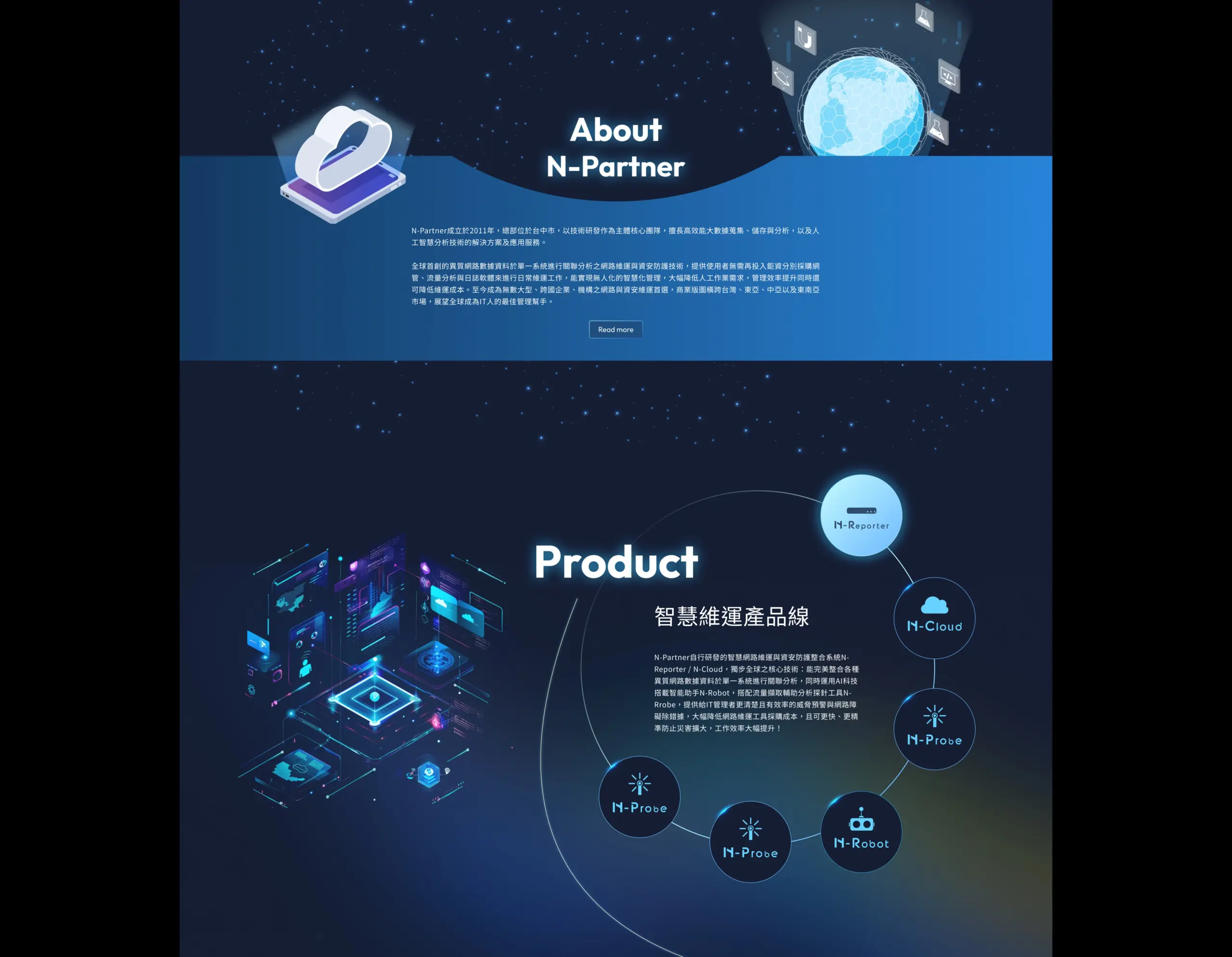 N-Partner 成立於 2010 年、總部設於台中,是一個以「智慧網路維運與資安防護」為核心的技術型公司,主打可將各種異質網路數據(例如 SNMP、Flow、Syslog 等)彙整到單一平台進行關聯分析,並以 N-Reporter、N-Cloud、N-Probe 與智能助手 N-Robot 等產品線提供整體維運自動化與威脅預警能力;網站以「從一個好工具,華麗蛻變成充滿智慧的維運助理」的敘事為主軸,強調技術自主與在地化服務,並同時支援多語系介面以面向區域市場。