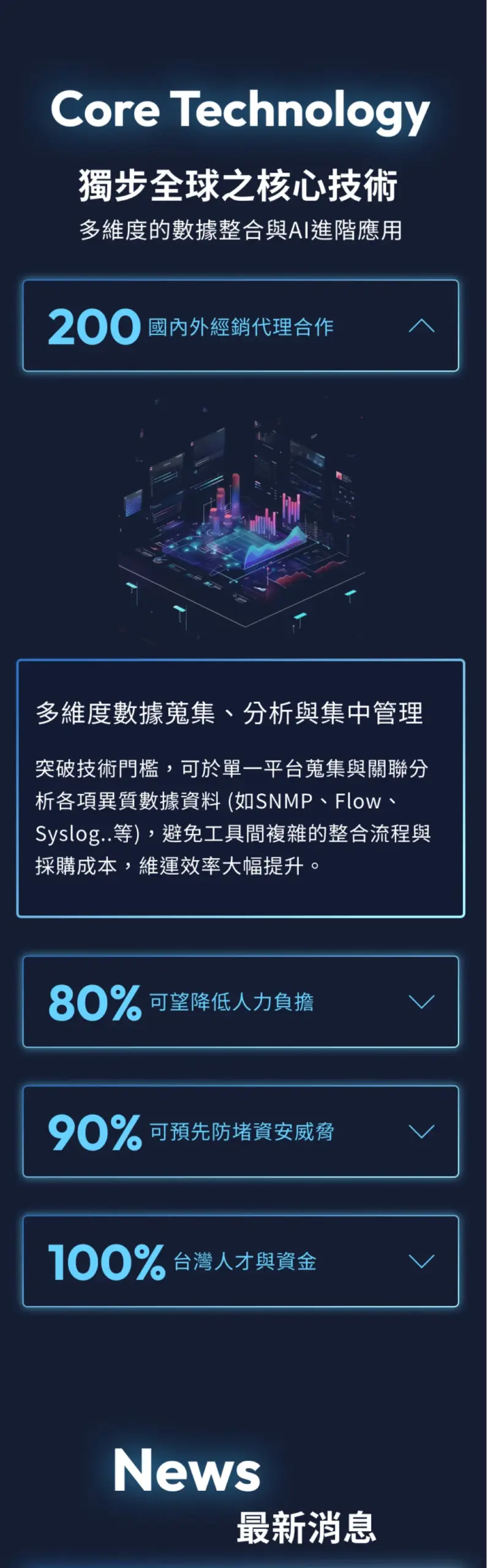 網站明確呈現的成果與功能主張是「以單一系統整合多源資料、以 AI 提供 24 小時主動監控與告警」,並強調可顯著降低人力負擔與提前防堵資安威脅,同時訴求可替企業節省多套工具採購成本、加速故障診斷與聯防處置,這些訴求透過產品說明、技術敘述與 KPI 顯示(如合作經銷數、效益百分比)構成説服力重點。