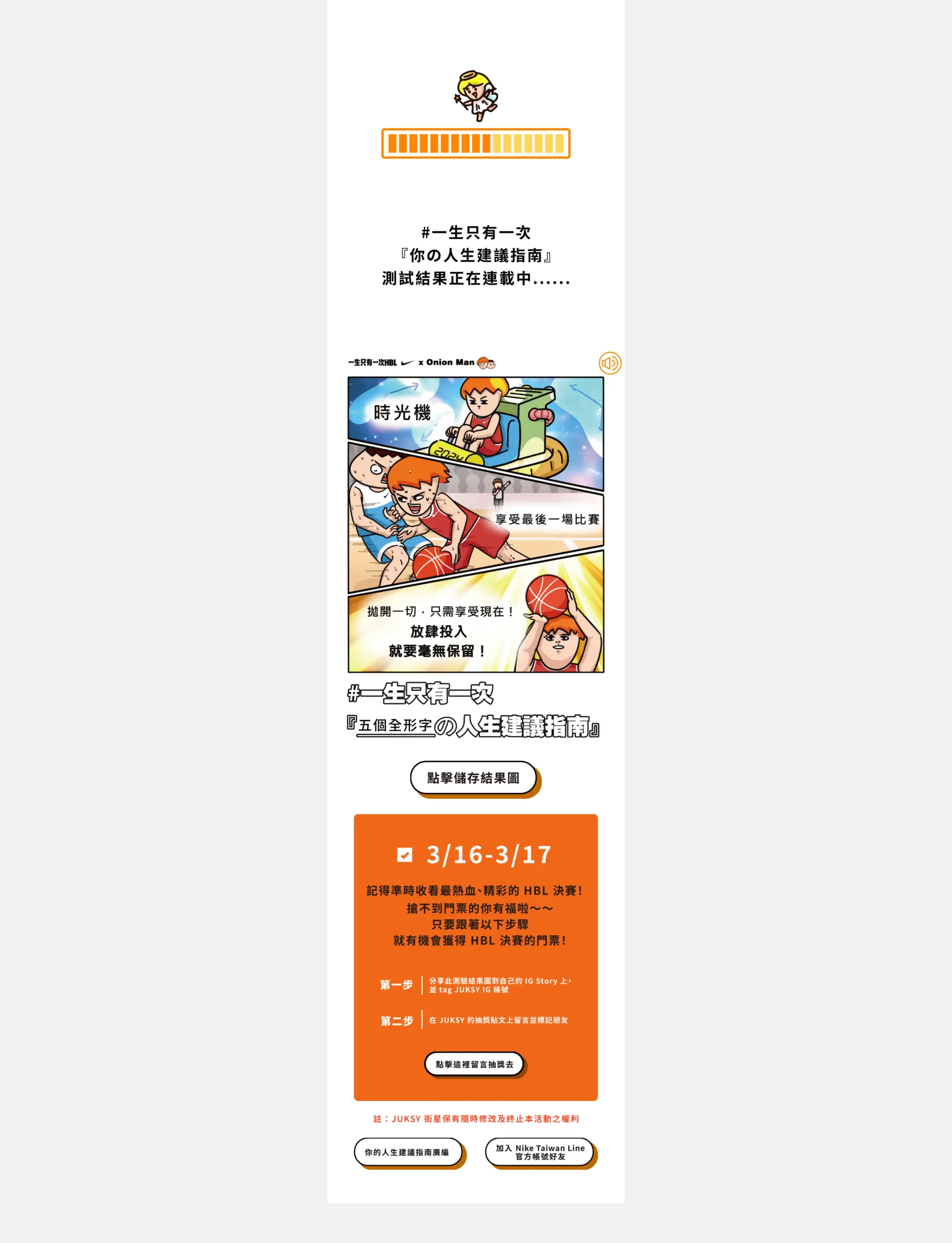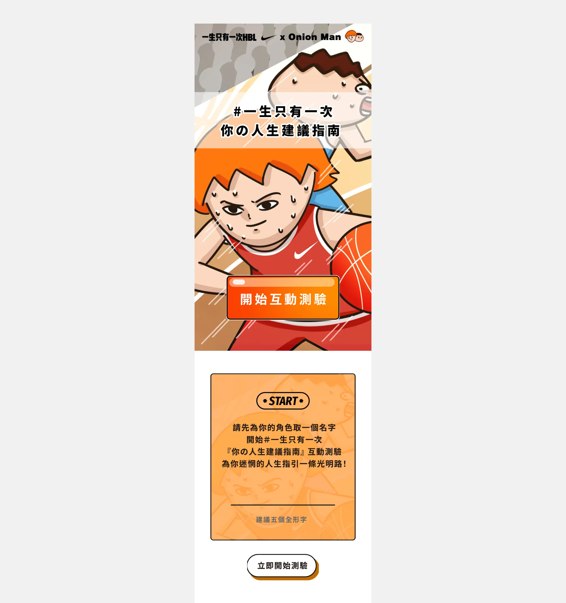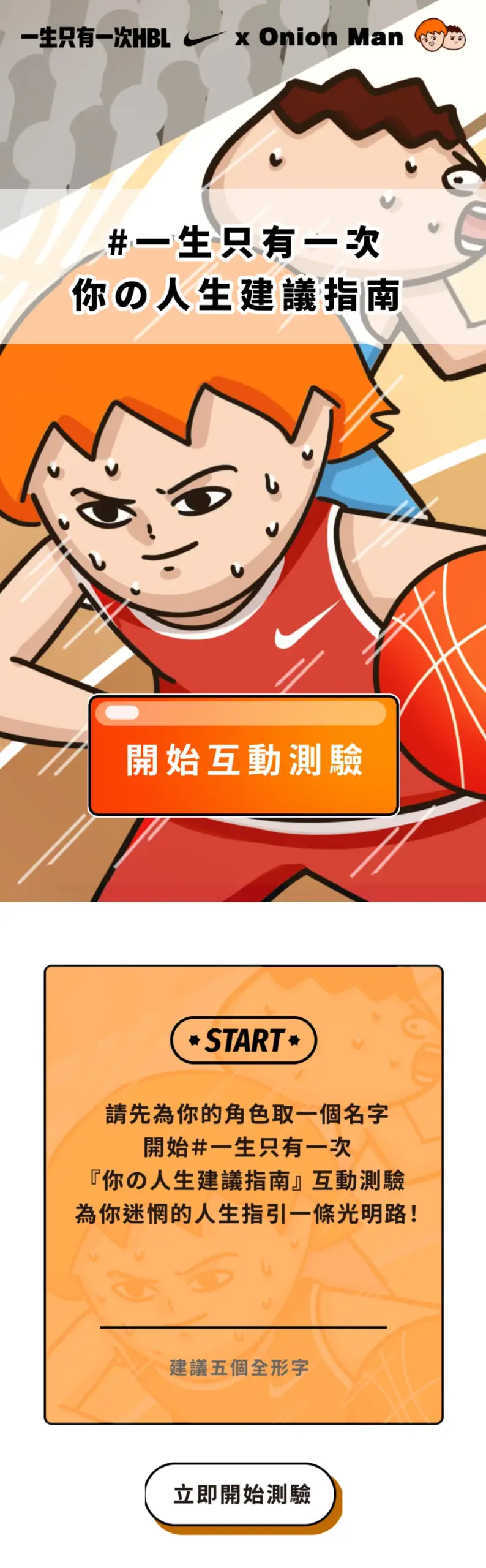 這是一個以「一生只有一次 HBL X Onion Man」為主題的互動式活動頁,故事場景設定在小巨蛋的 HBL 比賽最後關頭,透過「時光機」「遙控器」「神奇眼鏡」等富想像力的道具讓使用者在幾個選項中做出決策,頁面以短句與大圖帶出沉浸式敘事,並把測驗結果做成連載式內容,讓參與者有跟進後續的動機。