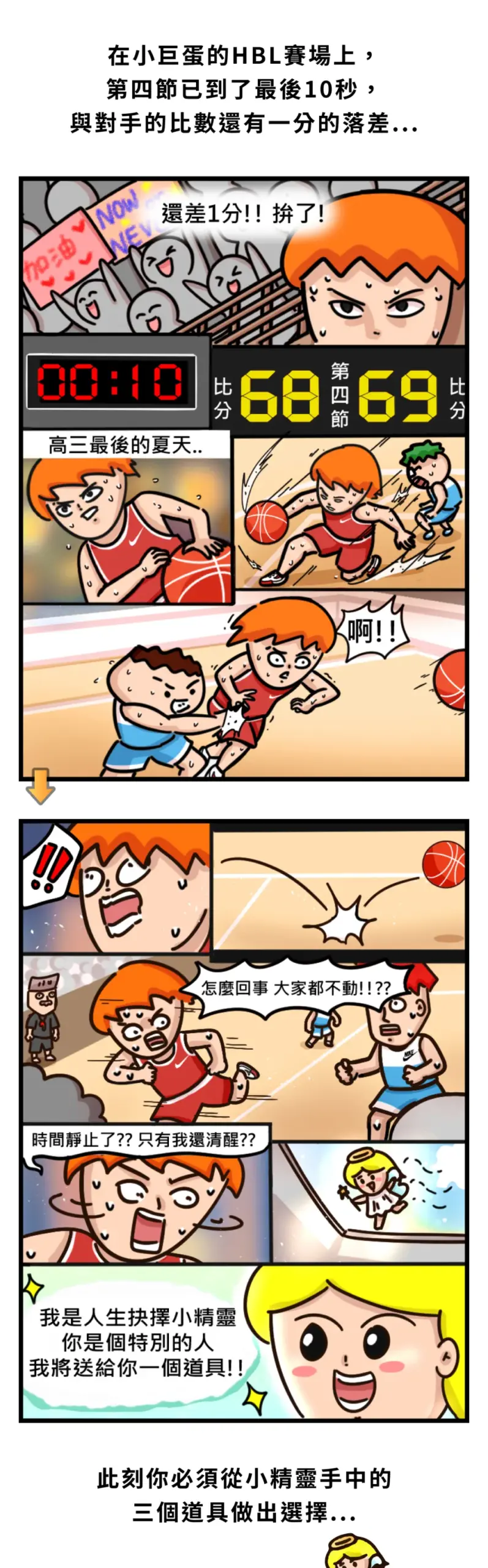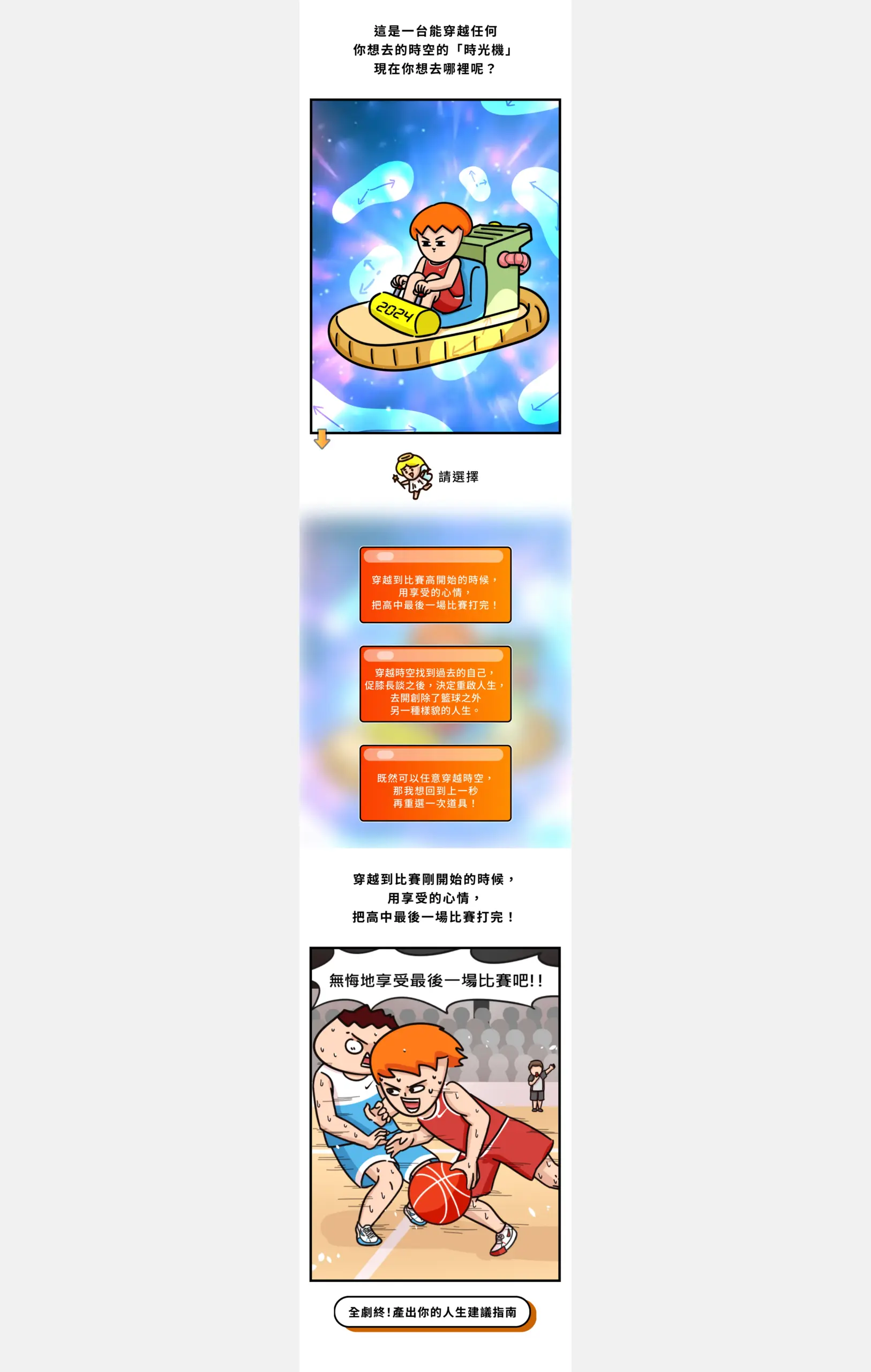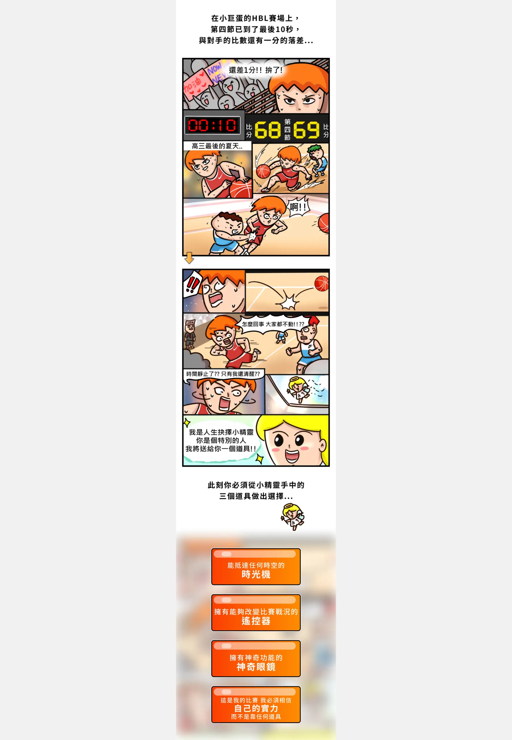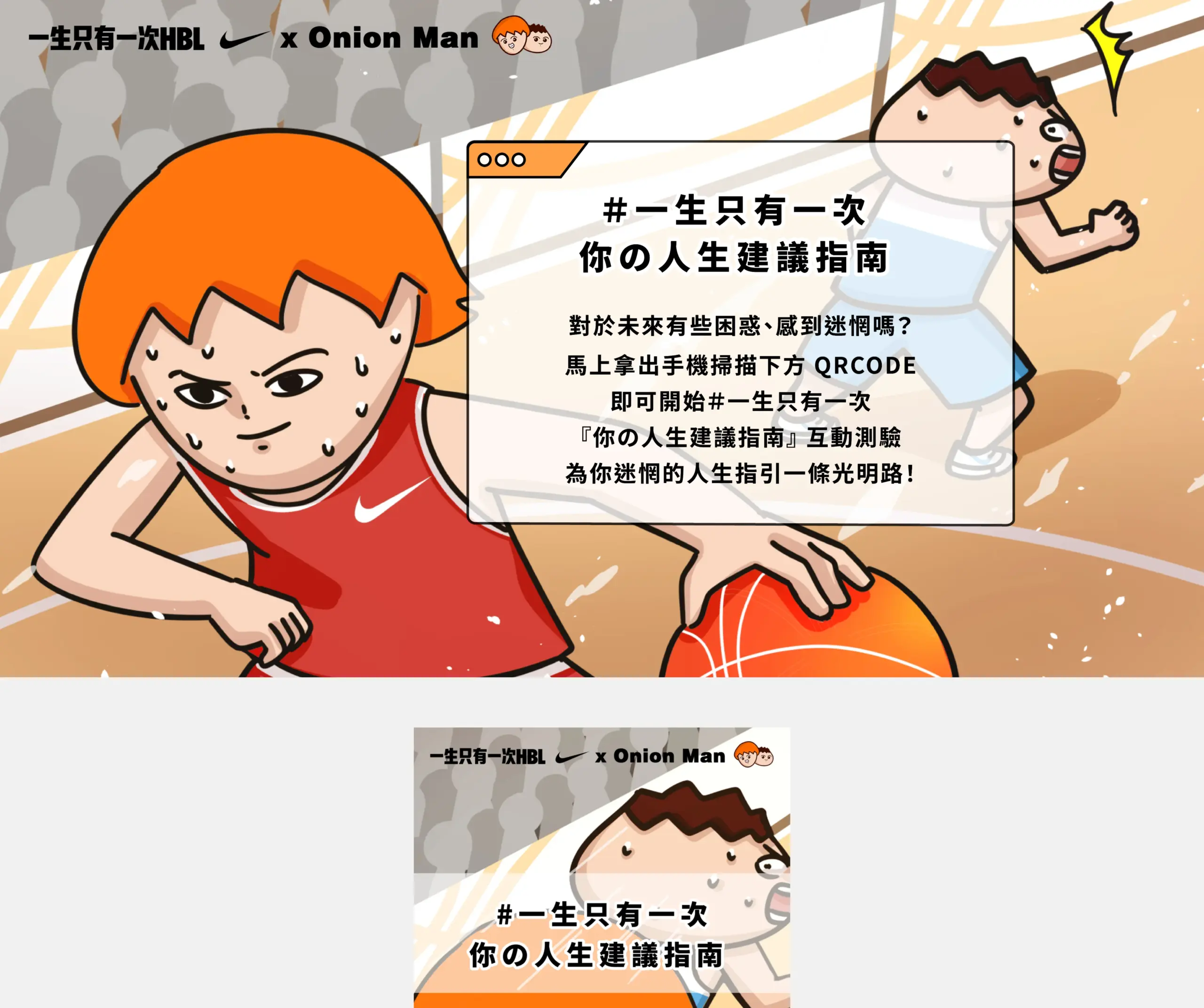 這是一個以「一生只有一次 HBL X Onion Man」為主題的互動式活動頁,故事場景設定在小巨蛋的 HBL 比賽最後關頭,透過「時光機」「遙控器」「神奇眼鏡」等富想像力的道具讓使用者在幾個選項中做出決策,頁面以短句與大圖帶出沉浸式敘事,並把測驗結果做成連載式內容,讓參與者有跟進後續的動機。