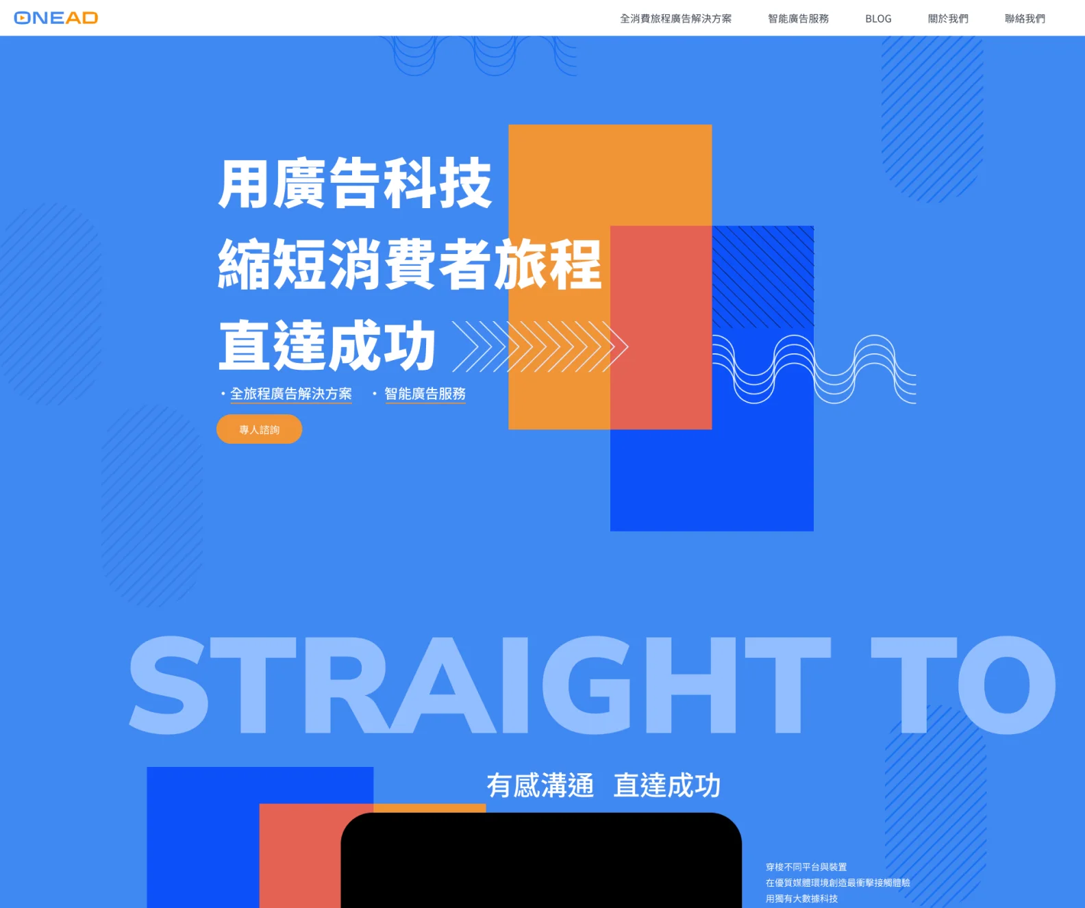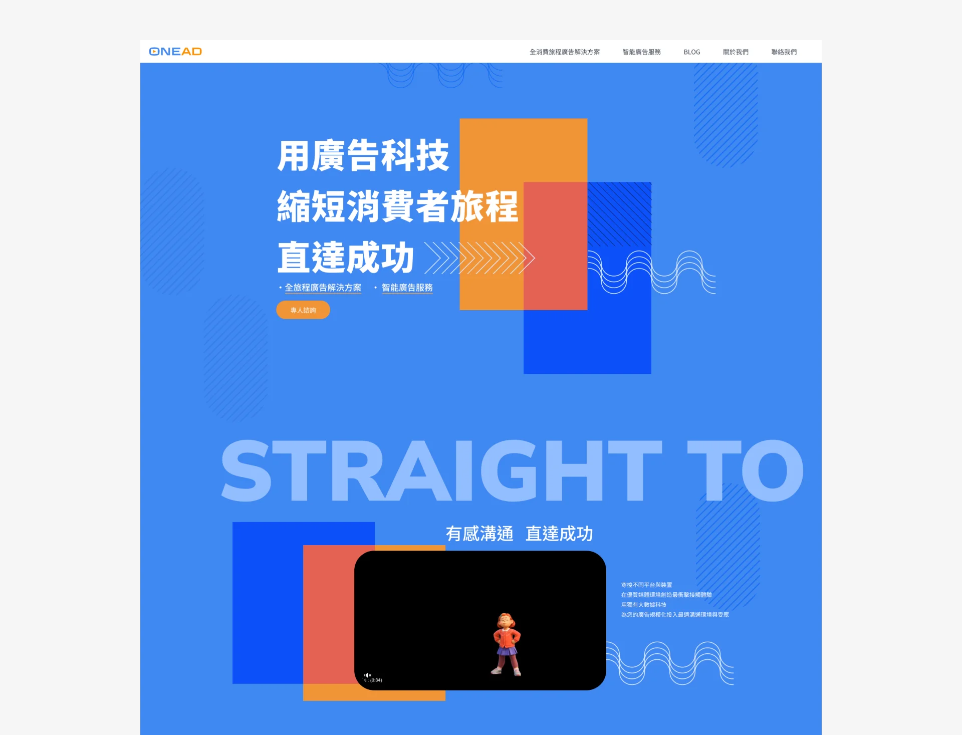 以「智能品牌廣告科技」為核心概念,強調以數據與 AI 技術驅動全消費旅程的廣告解決方案。網站設計呈現出科技感與專業感並重,色彩以明亮且具現代感的配色為主,搭配動態視覺元素,讓使用者能迅速理解 OneAD 提供的價值。網站的設計重點在於「直達成功」,透過動態圖像與視覺引導,傳達從品牌知名度拓展到精準導流的完整服務流程。