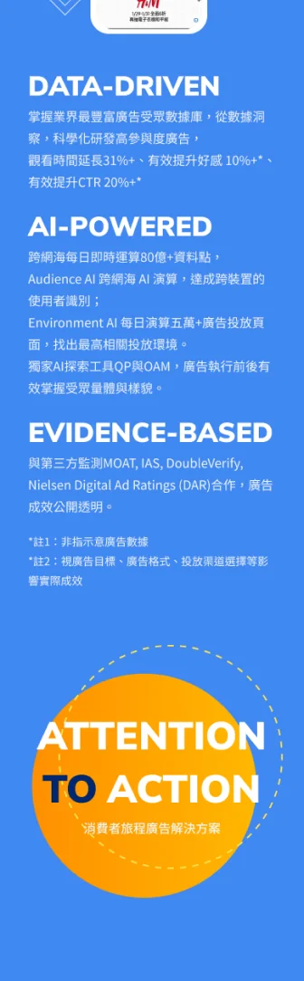 台灣最大品牌廣告科技公司。以時時創新的媒體科技與數據科技建構智慧廣告解方,在跨網環境實現有感溝通;成就領先市場的數位品牌力。