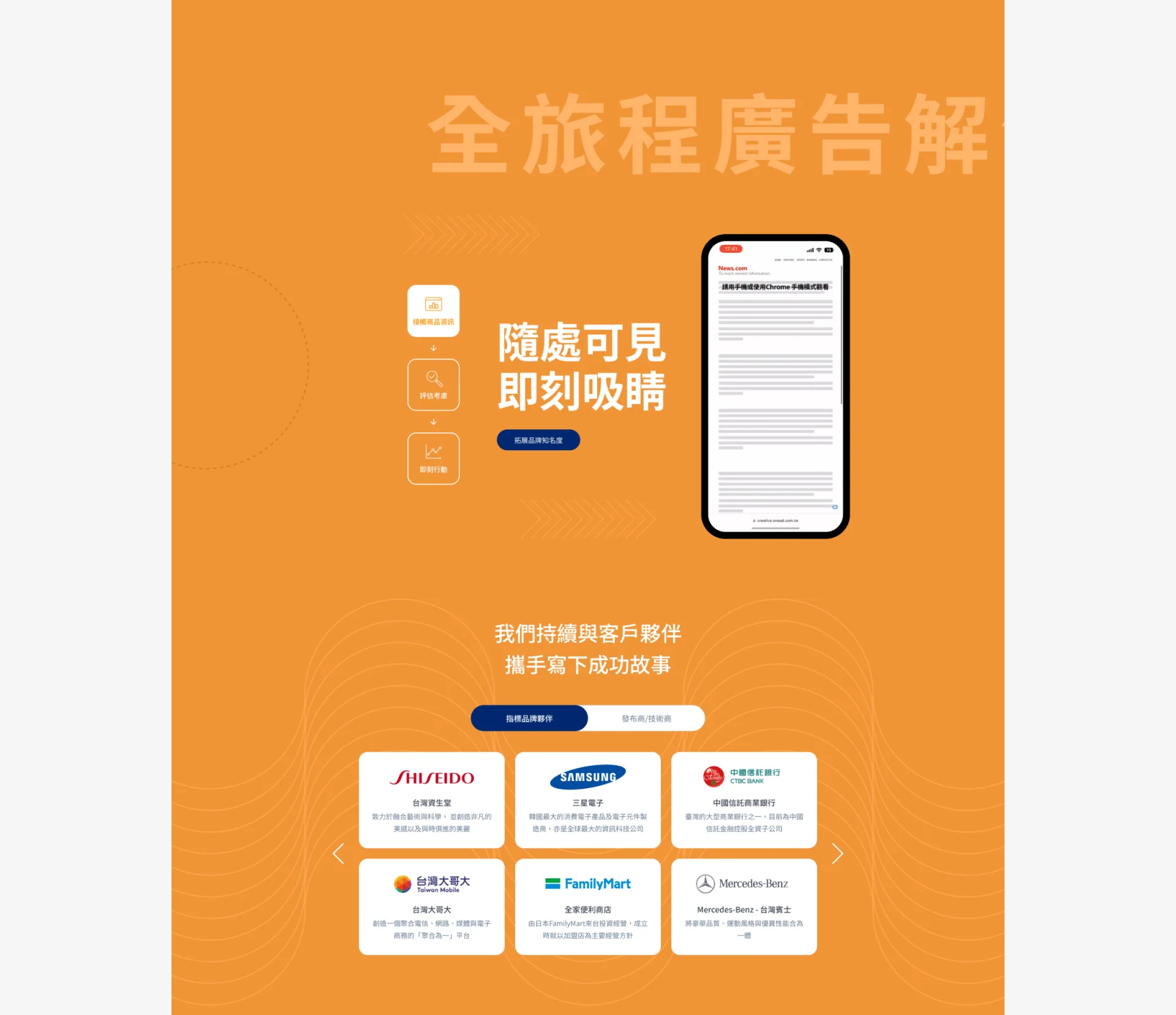 網站內容清晰地分為多個層次:全消費旅程解決方案、OneDATA 數據解決方案、廣告規劃與投放平台、品牌案例以及關於公司與聯絡資訊。每個方案部分都以視覺化圖像與簡明文字呈現核心概念,並結合數據與案例說明,增強信任感。品牌案例區域則展示合作品牌的成功故事,進一步凸顯服務成效與專業能力。整體內容呈現方式直觀,讓使用者可以快速理解各項服務及其價值。