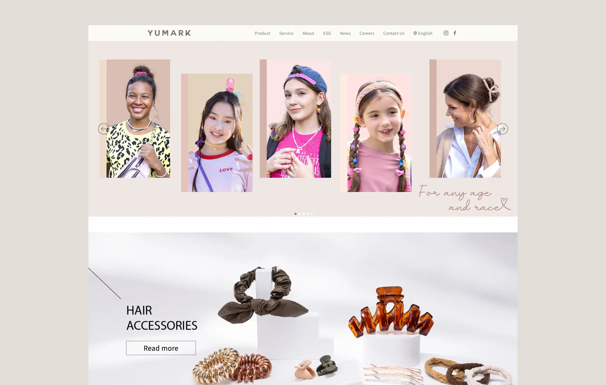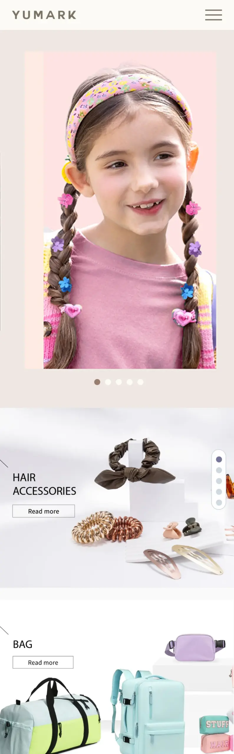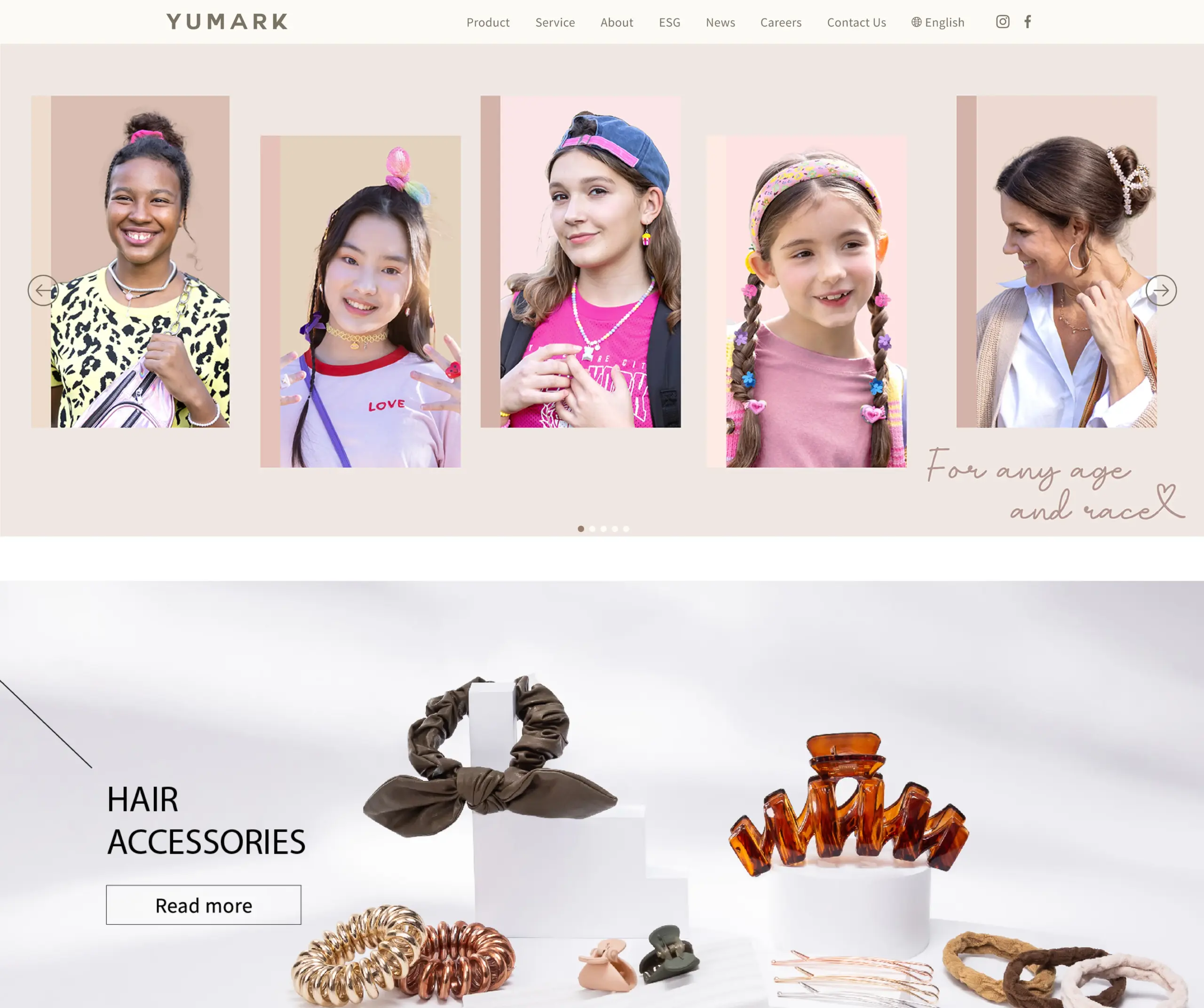 網站明確呈現 YUMARK 的產品線與服務重點,包括髮飾、包袋、飾品、美容用品與其他配件類別,頁面透過大量商品照與分類導覽讓訪客一眼就能找到想要的產品類別;同時也強調公司生產規模與國際辦公據點,這類資訊對於要找供應商或了解交貨能力的客戶來說,是最直接的信賴證明。