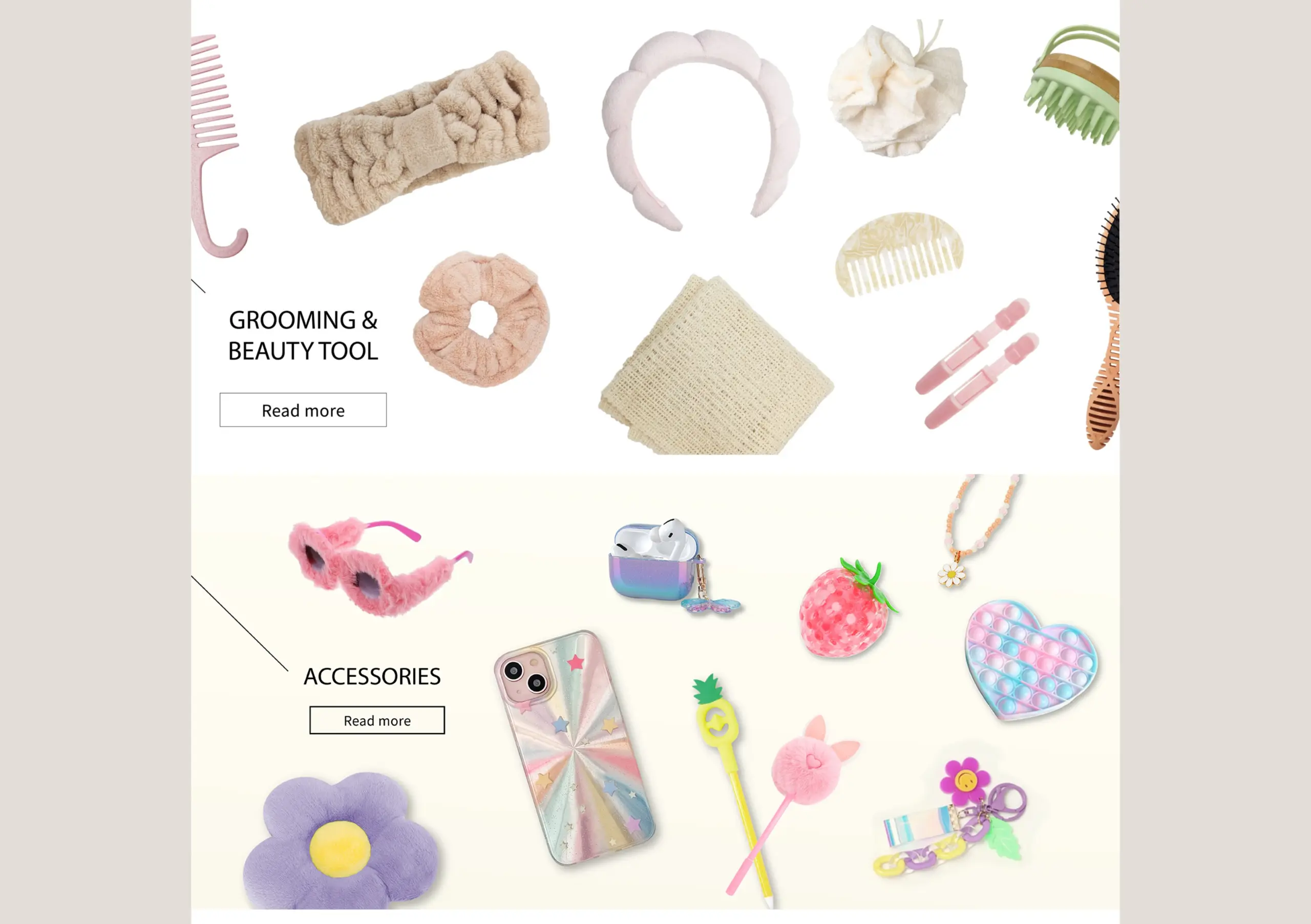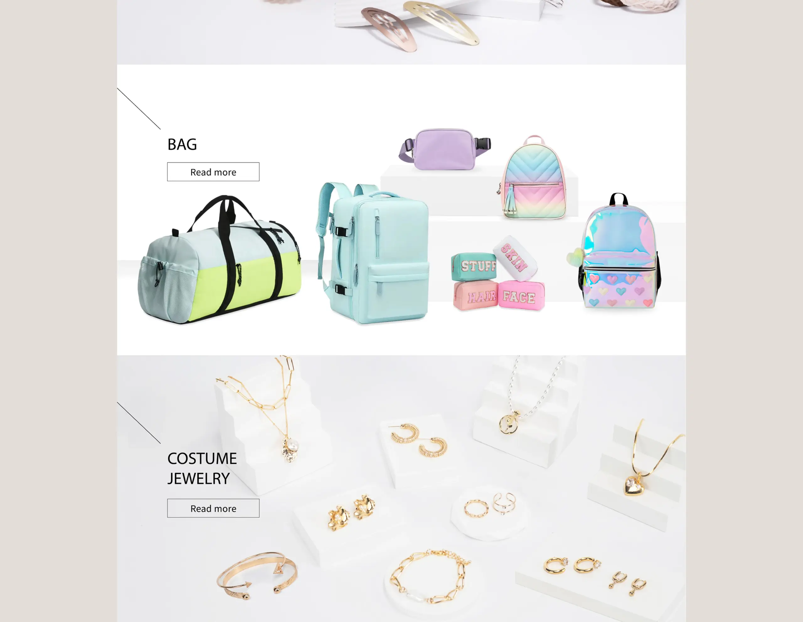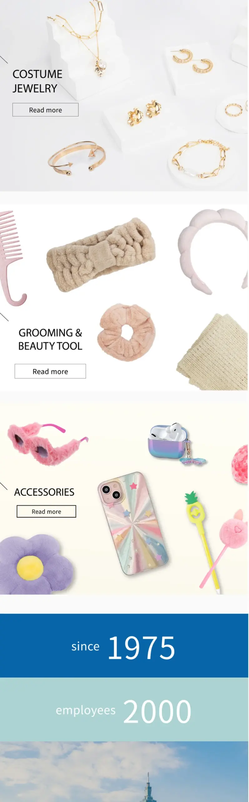 網站明確呈現 YUMARK 的產品線與服務重點,包括髮飾、包袋、飾品、美容用品與其他配件類別,頁面透過大量商品照與分類導覽讓訪客一眼就能找到想要的產品類別;同時也強調公司生產規模與國際辦公據點,這類資訊對於要找供應商或了解交貨能力的客戶來說,是最直接的信賴證明。